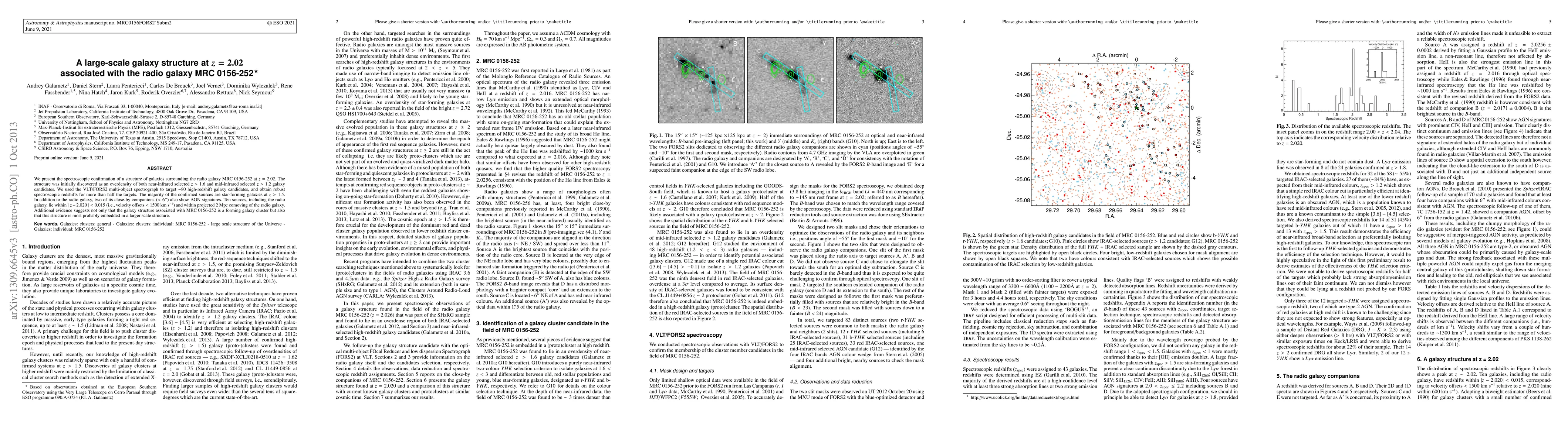 This paper confirms the existence of a large-scale galaxy structure at z = 2.02 surrounding the radio galaxy MRC0156-252, identified through spectroscopic redshifts of ~80 high-redshift galaxy candidates. The structure includes star-forming galaxies and AGN signatures, suggesting it is a forming galaxy cluster embedded in an even larger scale structure.