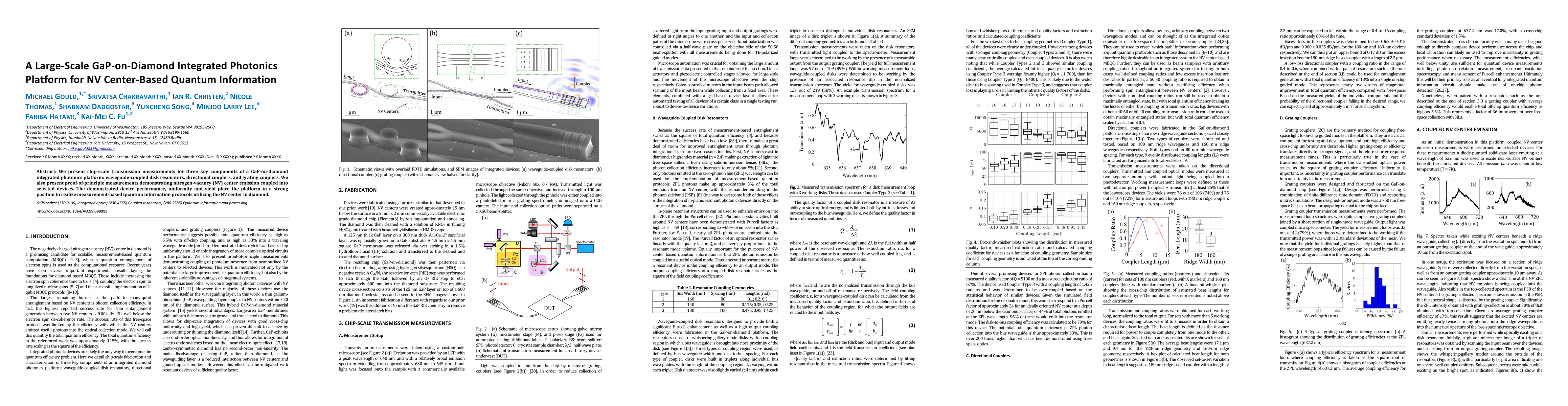 This research introduces a GaP-on-diamond photonics platform, evaluating its waveguide-coupled disk resonators, directional couplers, and grating couplers for performance and uniformity. It also demonstrates NV center emission coupling, positioning the platform for measurement-based quantum information protocols.