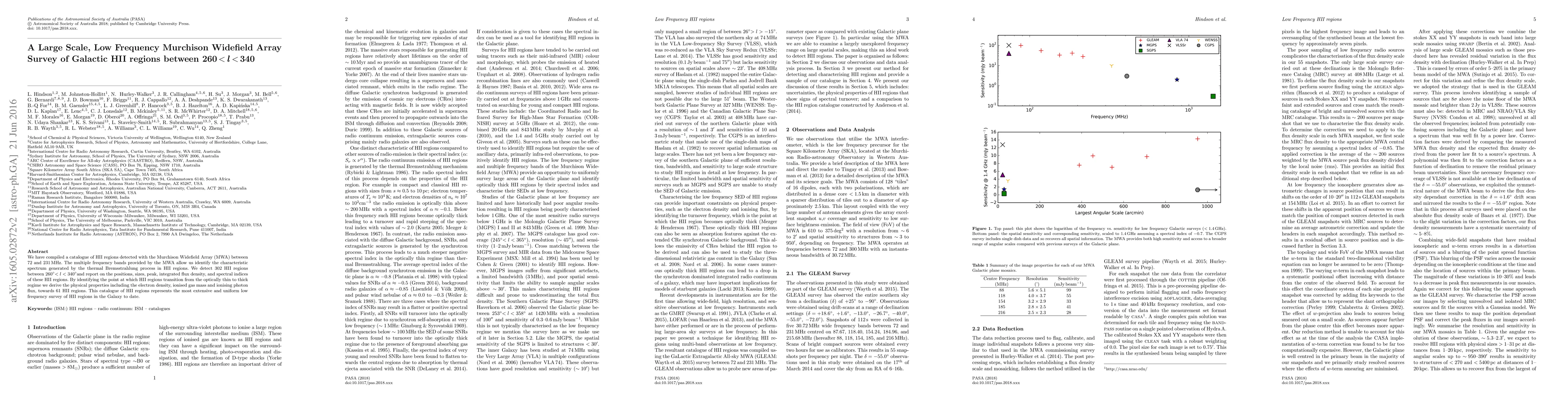 We have compiled a catalogue of HII regions detected with the Murchison Widefield Array (MWA) between 72 and 231MHz. The multiple frequency bands provided by the MWA allow us identify the characteristic spectrum generated by the thermal Bremsstrahlung process in HII regions. We detect 302 HII regions between 260 < l < 340 and report on the positions, sizes, peak, integrated flux density, and spectral indices of these HII regions. By identifying the point at which HII regions transition from the optically thin to thick regime we derive the physical properties including the electron density, ionised gas mass and ionising photon flux, towards 61 HII regions. This catalogue of HII regions represents the most extensive and uniform low frequency survey of HII regions in the Galaxy to date.