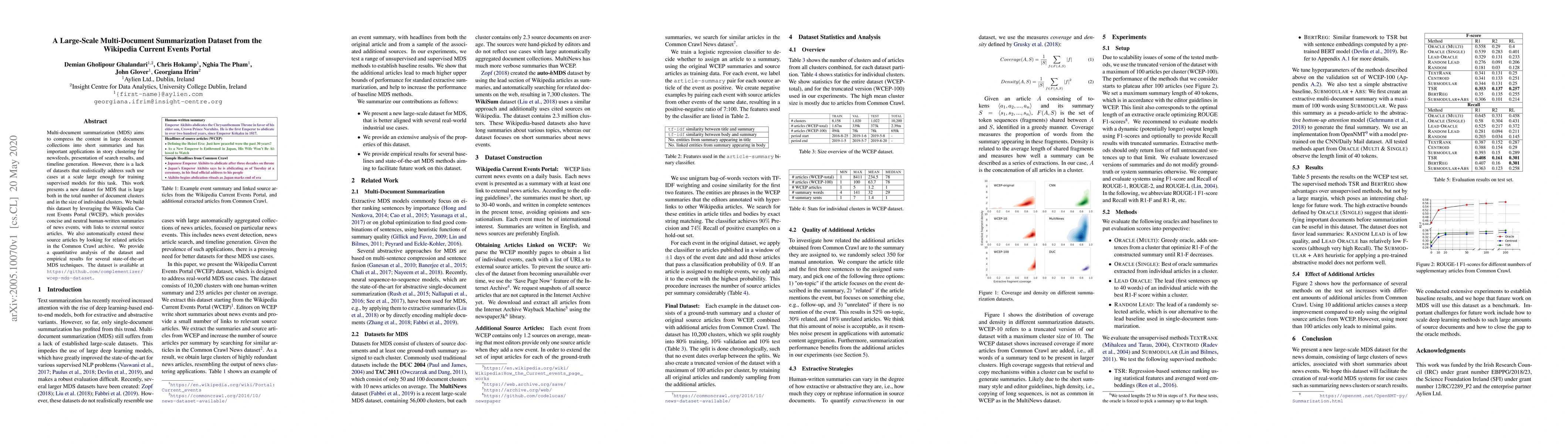 This paper introduces a large-scale multi-document summarization dataset derived from Wikipedia's Current Events Portal, aiming to address the lack of realistic datasets for training supervised models. The dataset includes extended source articles from the Common Crawl archive and provides quantitative analysis and empirical results for state-of-the-art MDS techniques.