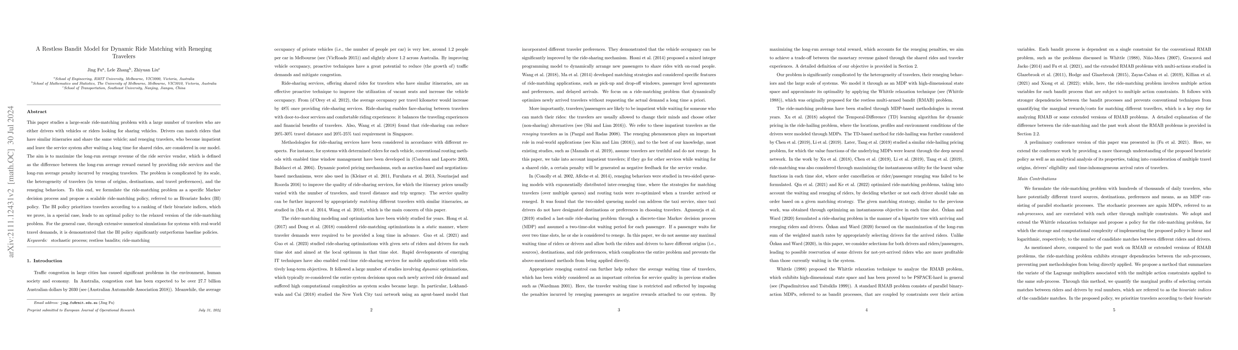 This paper studies a large-scale ride-matching problem in a transport center with a large number of passengers who are different in terms of destinations and travel preferences. Passengers with similar itineraries can match each other and share the same vehicle for their potentially different destinations; and reneging passengers, who become impatient and leave the service system after waiting long time for shared rides, are considered in our model. We aim to maximize the long-run average revenue of the ride service vendor, which is defined as the difference between the long-run average reward earned by providing ride services and the long-run average penalty incurred by reneging passengers. The problem is complicated by its scale, the heterogeneity of passengers, and the reneging behavior. To this end, we formate the ride-matching problem as a specific Markov decision process and propose a scalable ride-matching policy, referred to as Bivariate Index (BI) policy. We demonstrate that the ride-matching problem reduces to a conventional restless multi-armed bandit problem in a special case, for which the BI policy reduces to the well-known Whittle index policy that prioritizes passengers with the highest Whittle indices. For the general case, following the Whittle relaxation technique, BI prioritizes passengers according to their bivariate indices that are curves in a real-valued coordinate and are assigned to each passengers. We prove that the ranking of the bivariate indices can be derived by the ranking of corresponding Whittle indices in a surrogate system. Through extensive numerical simulations for systems with real-world travel demands, it is demonstrated that BI significantly outperforms baseline policies.