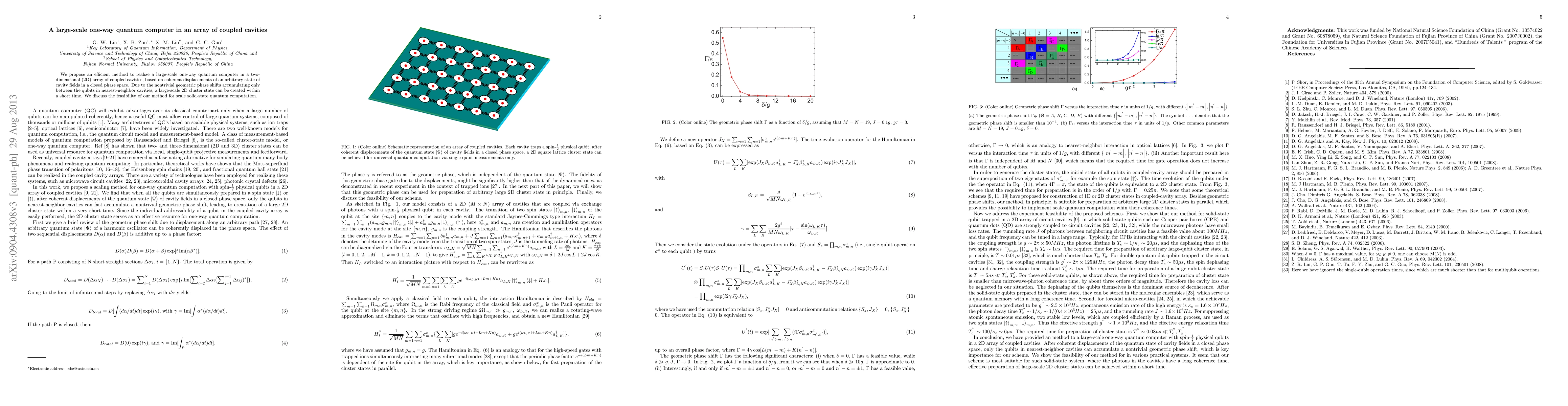 This paper proposes an efficient method to build a large-scale one-way quantum computer using a 2D array of coupled cavities, achieving cluster states through coherent displacements and geometric phase shifts. The approach focuses on solid-state quantum computation feasibility.