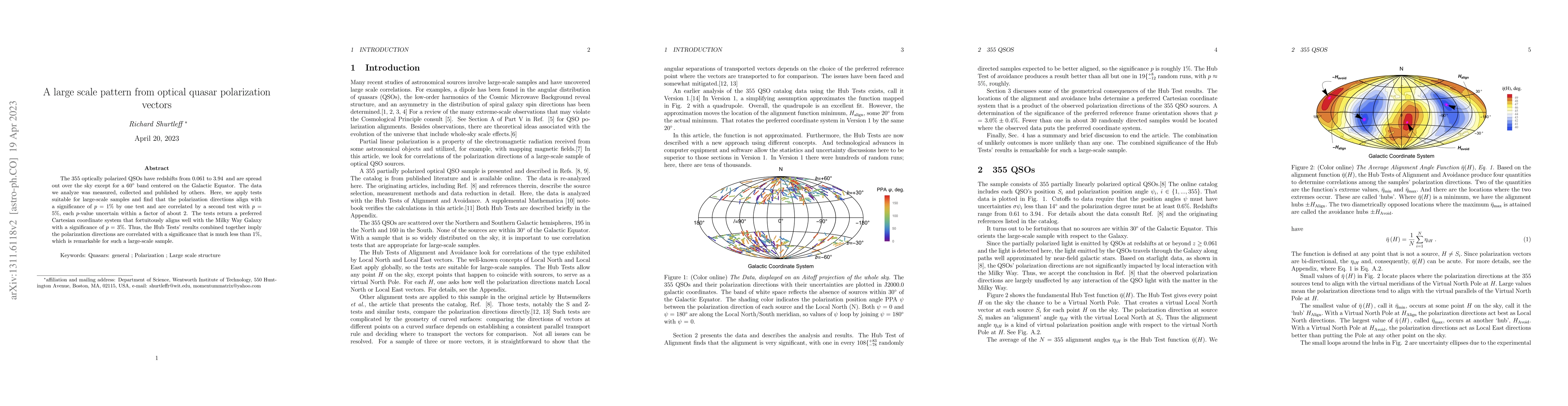 The 355 optically polarized QSOs have redshifts from 0.061 to 3.94 and are spread out over the sky except for a 60 degree band centered on the Galactic Equator. The data we analyze was measured, collected and published by others. Here, we apply tests suitable for large-scale samples and find that the polarization directions align with a significance of p = 1% by one test and are correlated by a second test with p = 5%, each p-value uncertain within a factor of about 2. The tests return a preferred Cartesian coordinate system that fortuitously aligns well with the Milky Way Galaxy with a significance of p = 3%. Thus, the Hub Tests' results combined together imply the polarization directions are correlated with a significance that is much less than 1%, which is remarkable for such a large-scale sample.