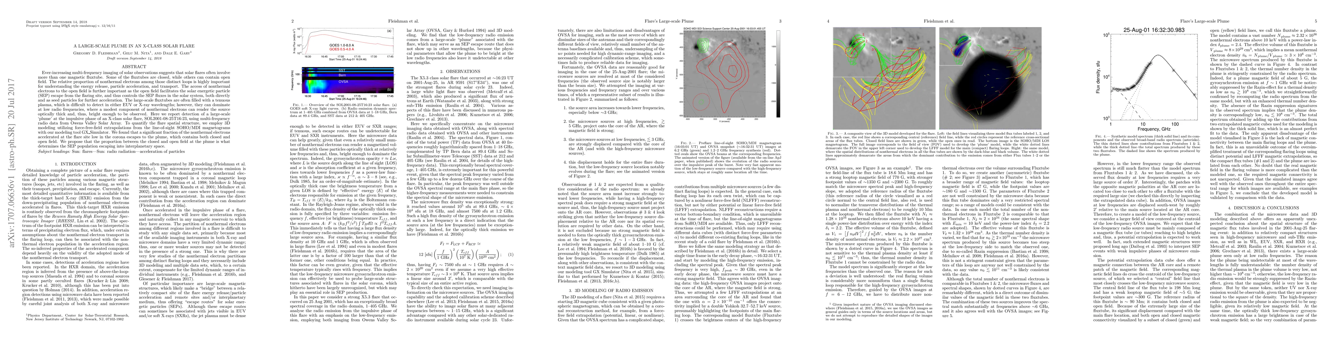Ever-increasing multi-frequency imaging of solar observations suggests that solar flares often involve more than one magnetic fluxtube. Some of the fluxtubes are closed, while others can contain open field. The relative proportion of nonthermal electrons among those distinct loops is highly important for understanding the energy release, particle acceleration, and transport. The access of nonthermal electrons to the open field is further important as the open field facilitates the solar energetic particle (SEP) escape from the flaring site, and thus controls the SEP fluxes in the solar system, both directly and as seed particles for further acceleration. The large-scale fluxtubes are often filled with a tenuous plasma, which is difficult to detect in either EUV or X-ray wavelengths; however, they can dominate at low radio frequencies, where a modest component of nonthermal electrons can render the source optically thick and, thus, bright enough to be observed. Here we report detection of a large-scale `plume' at the impulsive phase of an X-class solar flare, SOL2001-08-25T16:23, using multi-frequency radio data from Owens Valley Solar Array. To quantify the flare spatial structure, we employ 3D modeling utilizing force-free-field extrapolations from the line-of-sight SOHO/MDI magnetograms with our modeling tool GX Simulator. We found that a significant fraction of the nonthermal electrons accelerated at the flare site low in the corona escapes to the plume, which contains both closed and open field. We propose that the proportion between the closed and open field at the plume is what determines the SEP population escaping into interplanetary space.