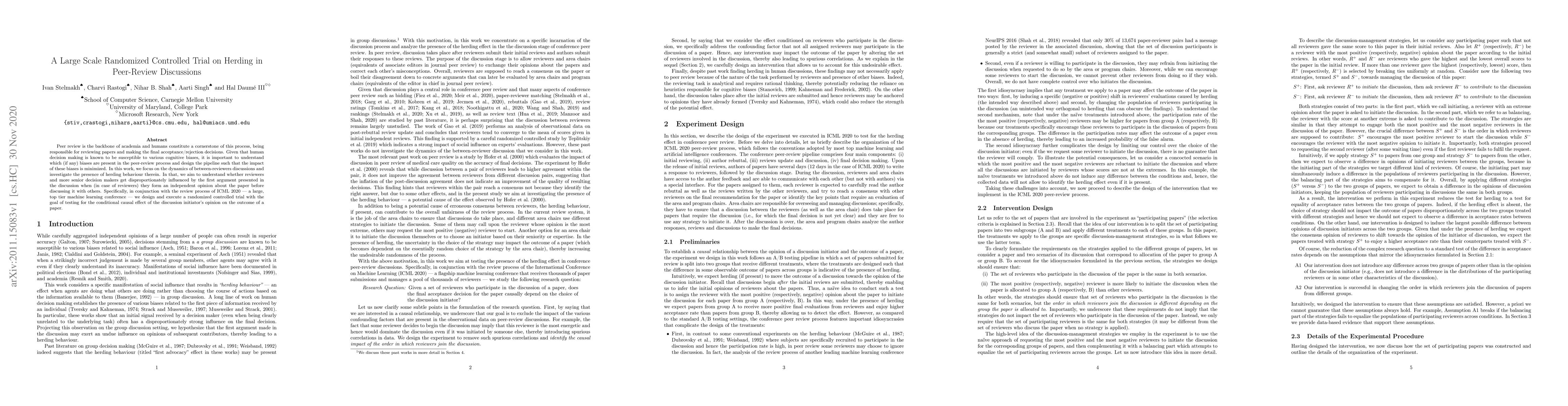 Peer review is the backbone of academia and humans constitute a cornerstone of this process, being responsible for reviewing papers and making the final acceptance/rejection decisions. Given that human decision making is known to be susceptible to various cognitive biases, it is important to understand which (if any) biases are present in the peer-review process and design the pipeline such that the impact of these biases is minimized. In this work, we focus on the dynamics of between-reviewers discussions and investigate the presence of herding behaviour therein. In that, we aim to understand whether reviewers and more senior decision makers get disproportionately influenced by the first argument presented in the discussion when (in case of reviewers) they form an independent opinion about the paper before discussing it with others. Specifically, in conjunction with the review process of ICML 2020 -- a large, top tier machine learning conference -- we design and execute a randomized controlled trial with the goal of testing for the conditional causal effect of the discussion initiator's opinion on the outcome of a paper.