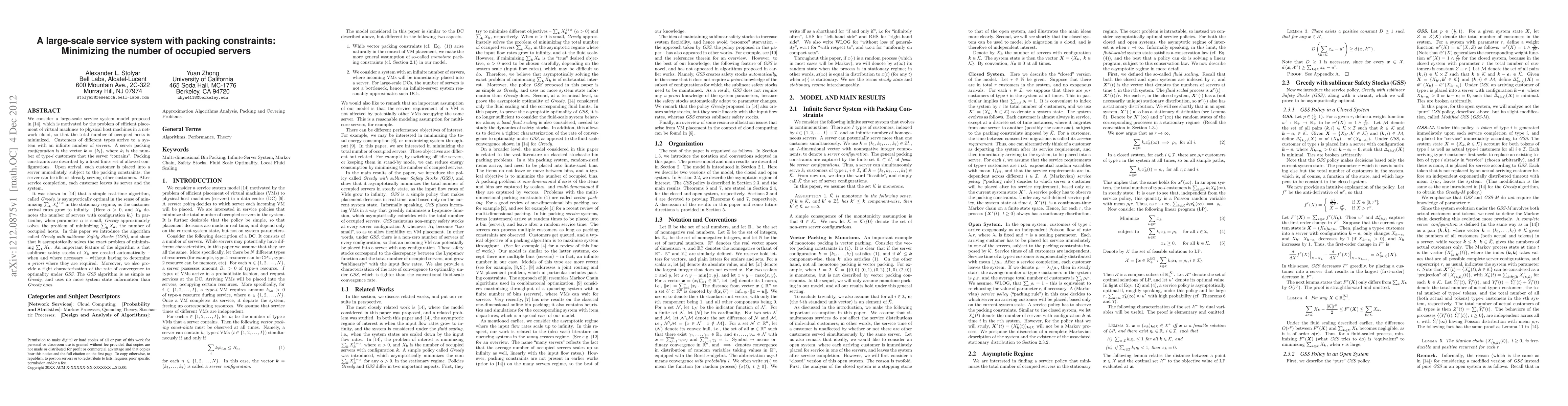 We consider a large-scale service system model motivated by the problem of efficient placement of virtual machines to physical host machines in a network cloud, so that the total number of occupied hosts is minimized. Customers of different types arrive to a system with an infinite number of servers. A server packing configuration is the vector $k = (k_i)$, where $k_i$ is the number of type-$i$ customers that the server "contains". Packing constraints are described by a fixed finite set of allowed configurations. Upon arrival, each customer is placed into a server immediately, subject to the packing constraints; the server can be idle or already serving other customers. After service completion, each customer leaves its server and the system. It was shown recently that a simple real-time algorithm, called Greedy, is asymptotically optimal in the sense of minimizing $\sum_k X_k^{1+\alpha}$ in the stationary regime, as the customer arrival rates grow to infinity. (Here \alpha >0, and $X_k$ denotes the number of servers with configuration $k$.) In particular, when parameter \alpha is small, Greedy approximately solves the problem of minimizing $\sum_k X_k$, the number of occupied hosts. In this paper we introduce the algorithm called Greedy with sublinear Safety Stocks (GSS), and show that it asymptotically solves the exact problem of minimizing $\sum_k X_k$. An important feature of the algorithm is that sublinear safety stocks of $X_k$ are created automatically - when and where necessary - without having to determine a priori where they are required. Moreover, we also provide a tight characterization of the rate of convergence to optimality under GSS. The GSS algorithm is as simple as Greedy, and uses no more system state information than Greedy does.