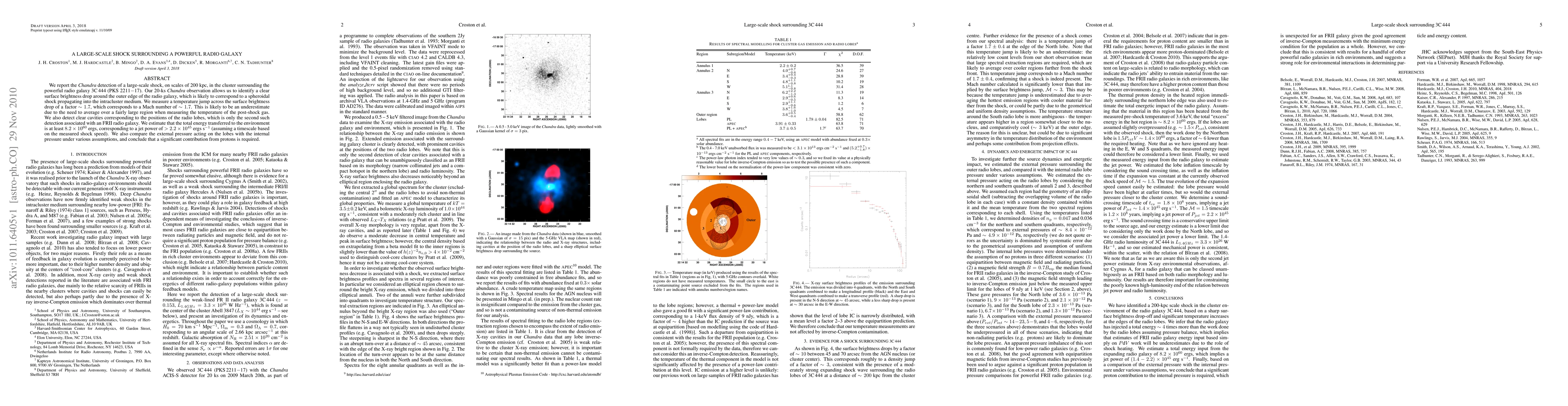 We report the Chandra detection of a large-scale shock, on scales of 200 kpc, in the cluster surrounding the powerful radio galaxy 3C 444 (PKS 2211-17). Our 20-ks Chandra observation allows us to identify a clear surface brightness drop around the outer edge of the radio galaxy, which is likely to correspond to a spheroidal shock propagating into the intracluster medium. We measure a temperature jump across the surface brightness drop of a factor ~1.7, which corresponds to a Mach number of ~1.7. This is likely to be an underestimate due to the need to average over a fairly large region when measuring the temperature of the post-shock gas. We also detect clear cavities corresponding to the positions of the radio lobes, which is only the second such detection associated with an FRII radio galaxy. We estimate that the total energy transferred to the environment is at least 8.2 x 10^60 ergs, corresponding to a jet power of >2.2 x 10^45 ergs s^-1 (assuming a timescale based on the measured shock speed). We also compare the external pressure acting on the lobes with the internal pressure under various assumptions, and conclude that a significant contribution from protons is required.