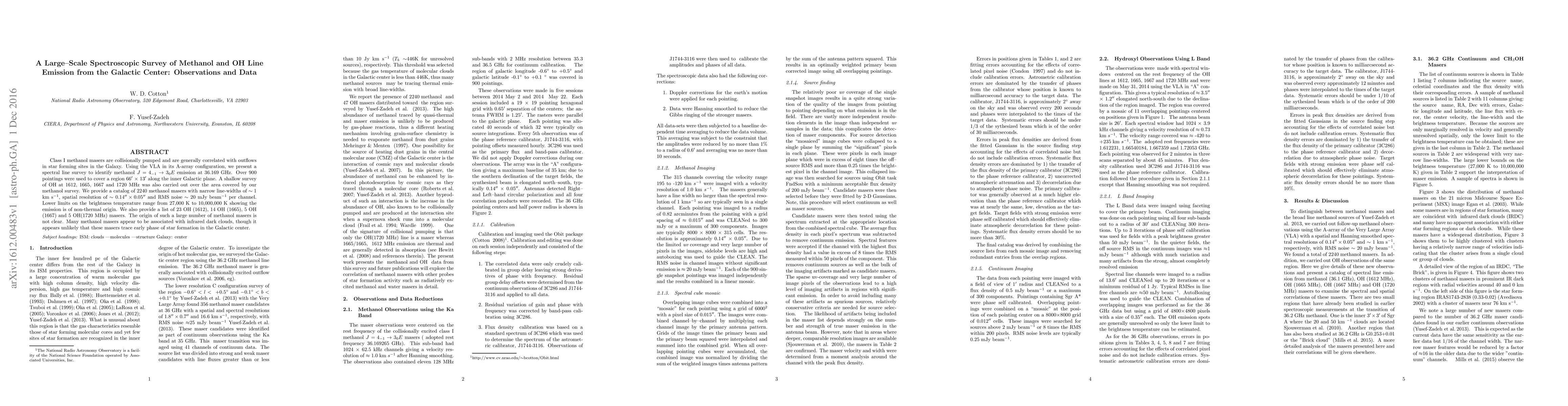 Class I methanol masers are collisionally pumped and are generally correlated with outflows in star forming sites in the Galaxy. Using the VLA in its A-array configuration, we present a spectral line survey to identify methanol $J=4_{-1}\rightarrow3_0E$ emission at 36.169~GHz. Over 900 pointings were used to cover a region 66'x13'along the inner Galactic plane. A shallow survey of OH at 1612, 1665, 1667 and 1720 MHz was also carried out over the area covered by our methanol survey. We provide a catalog of 2240 methanol masers with narrow line-widths of $\sim1$ km s$^{-1}$, spatial resolution of ~0.14"x0.05" and RMS noise $\sim20$ mJy beam$^{-1}$ per channel. Lower limits on the brightness temperature range from 27,000 K to 10,000,000 K showing the emission is of non-thermal origin. We also provide a list of 23 OH (1612), 14 OH (1665), 5 OH (1667) and 5 OH(1720 MHz) masers. The origin of such a large number of methanol masers is not clear. Many methanol masers appear to be associated with infrared dark clouds, though it appears unlikely that the entire population of masers trace early phase of star formation in the Galactic center.