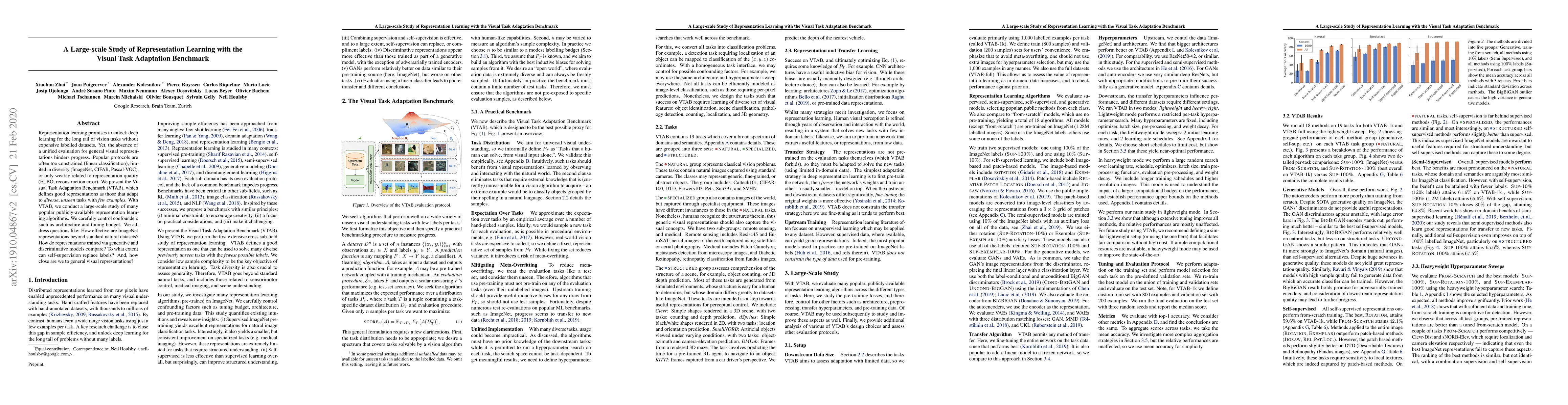 This paper introduces the Visual Task Adaptation Benchmark (VTAB) to evaluate the effectiveness of various representation learning algorithms across diverse, unseen tasks. The study assesses how well representations generalize beyond standard datasets and explores the comparative effectiveness of generative vs. discriminative training methods, the role of self-supervision, and the progress towards achieving general visual representations.