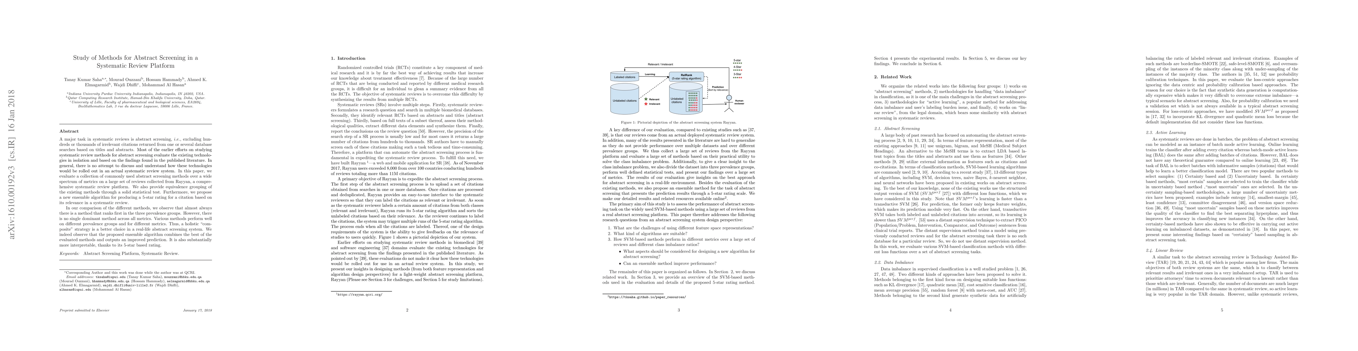 A major task in systematic reviews is abstract screening, i.e., excluding, often hundreds or thousand of, irrelevant citations returned from a database search based on titles and abstracts. Thus, a systematic review platform that can automate the abstract screening process is of huge importance. Several methods have been proposed for this task. However, it is very hard to clearly understand the applicability of these methods in a systematic review platform because of the following challenges: (1) the use of non-overlapping metrics for the evaluation of the proposed methods, (2) usage of features that are very hard to collect, (3) using a small set of reviews for the evaluation, and (4) no solid statistical testing or equivalence grouping of the methods. In this paper, we use feature representation that can be extracted per citation. We evaluate SVM-based methods (commonly used) on a large set of reviews ($61$) and metrics ($11$) to provide equivalence grouping of methods based on a solid statistical test. Our analysis also includes a strong variability of the metrics using $500$x$2$ cross validation. While some methods shine for different metrics and for different datasets, there is no single method that dominates the pack. Furthermore, we observe that in some cases relevant (included) citations can be found after screening only 15-20% of them via a certainty based sampling. A few included citations present outlying characteristics and can only be found after a very large number of screening steps. Finally, we present an ensemble algorithm for producing a $5$-star rating of citations based on their relevance. Such algorithm combines the best methods from our evaluation and through its $5$-star rating outputs a more easy-to-consume prediction.