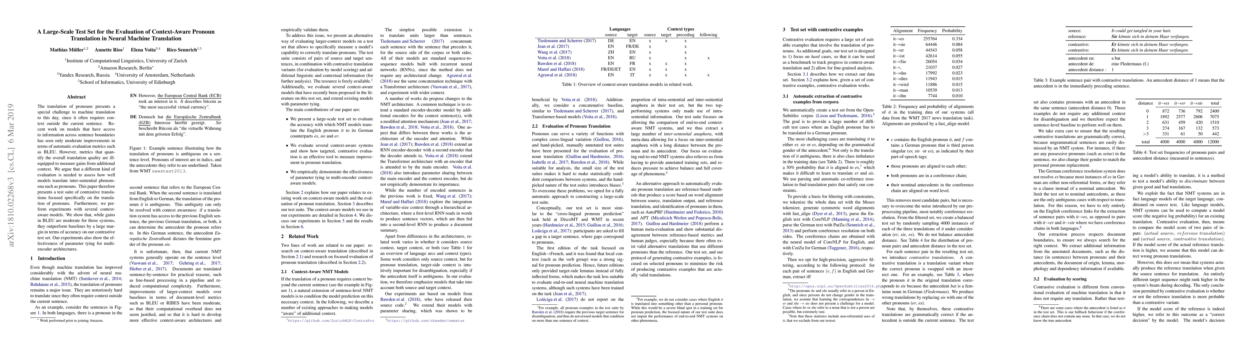 This paper introduces a large-scale test set for evaluating context-aware pronoun translation in neural machine translation, demonstrating that while improvements in automatic metrics like BLEU are moderate, context-aware models significantly outperform baselines on their custom test set, highlighting the need for specialized evaluation methods.