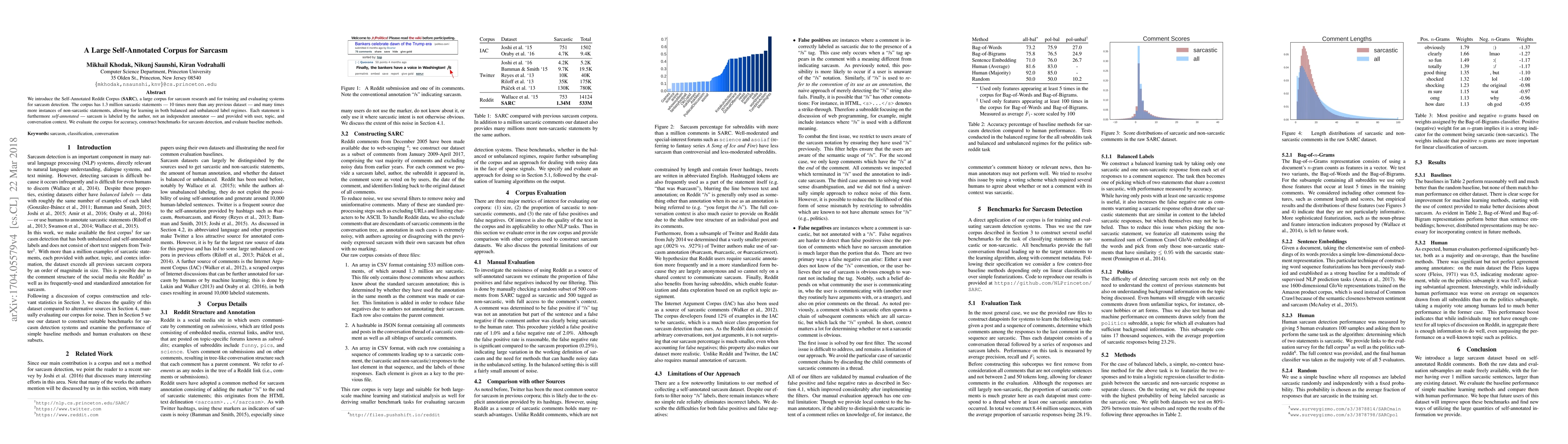 The Self-Annotated Reddit Corpus (SARC) offers 1.3 million self-annotated sarcastic statements, vastly larger than prior datasets, facilitating balanced and unbalanced sarcasm detection training. The corpus also includes user, topic, and conversation context, and serves as a benchmark for evaluating sarcasm detection methods.
