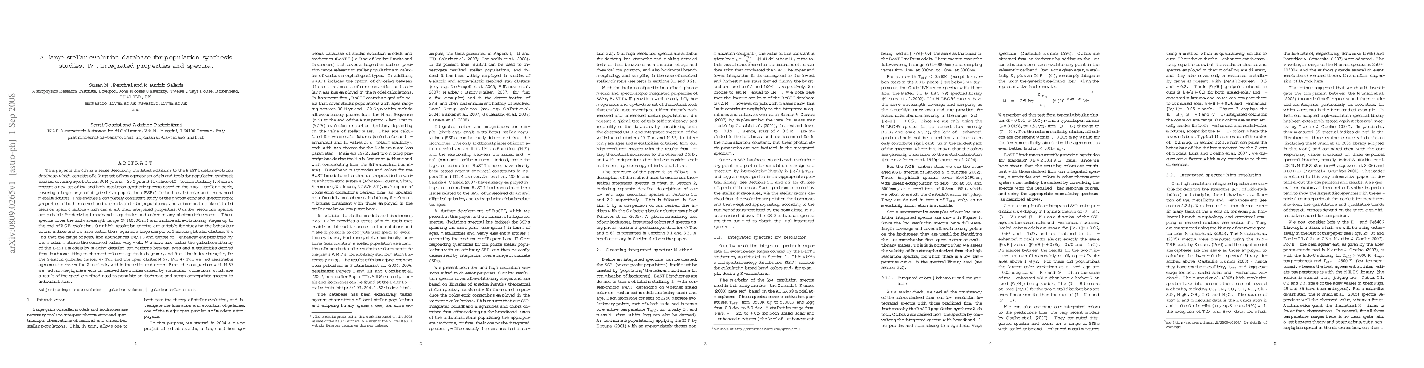 This paper is the 4th in a series describing the latest additions to the BaSTI stellar evolution database, which consists of a large set of homogeneous models and tools for population synthesis studies. Here we present a new set of low and high resolution synthetic spectra based on the BaSTI stellar models, covering a large range of simple stellar populations (SSPs) for both scaled solar and alpha-enhanced metal mixtures. This enables a completely consistent study of the photometric and spectroscopic properties of both resolved and unresolved stellar populations, and allows us to make detailed tests on their integrated properties. Our low resolution spectra are suitable for deriving broadband magnitudes and colors in any photometric system. These spectra cover the full wavelength range (9-160000nm) and include all evolutionary stages up to the end of AGB evolution. Our high resolution spectra are suitable for studying the behaviour of line indices and we have tested them against a large sample of Galactic globular clusters. We find that the range of ages, iron abundances [Fe/H], and degree of alpha-enhancement predicted by the models matches observed values very well. We have also tested the global consistency of the BaSTI models by making detailed comparisons between ages and metallicities derived from isochrone fitting to observed CMDs, and from line index strengths, for the Galactic globular cluster 47Tuc and the open cluster M67. For 47Tuc we find reasonable agreement between the 2 methods, within the estimated errors. From the comparison with M67 we find non-negligible effects on derived line indices caused by statistical fluctuations, which are a result of the specific method used to populate an isochrone and assign appropriate spectra to individual stars. (abridged)