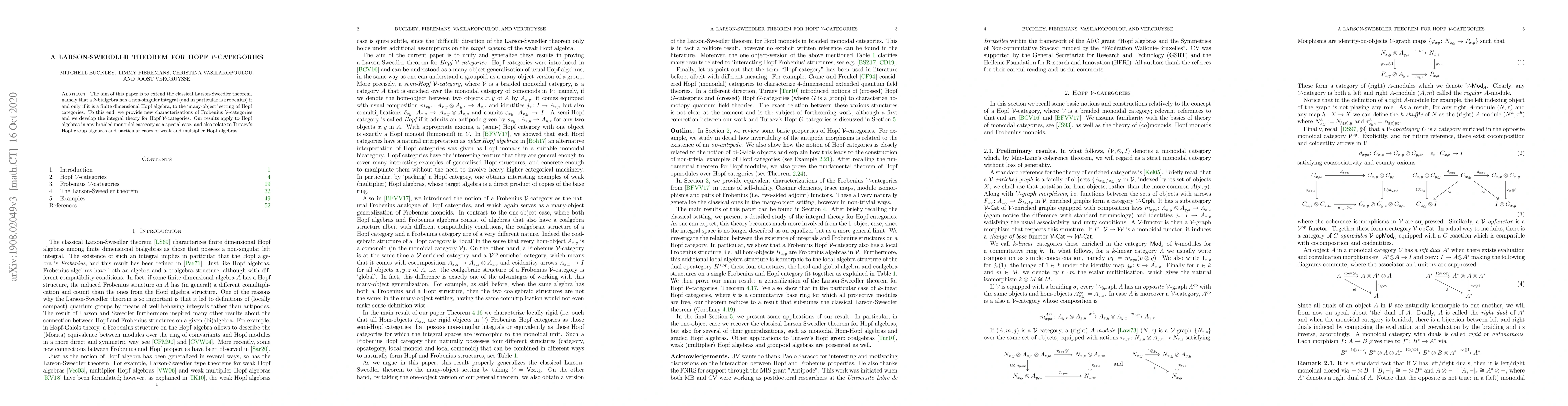 The aim of this paper is to extend the classical Larson-Sweedler theorem, namely that a k-bialgebra has a non-singular integral (and in particular is Frobenius) if and only if it is a finite dimensional Hopf algebra, to the `many-object' setting of Hopf categories. To this end, we provide new characterizations of Frobenius V-categories and we develop the integral theory for Hopf V-categories. Our results apply to Hopf algebras in any braided monoidal category as a special case, and also relate to Turaev's Hopf group algebras and particular cases of weak and multiplier Hopf algebras.