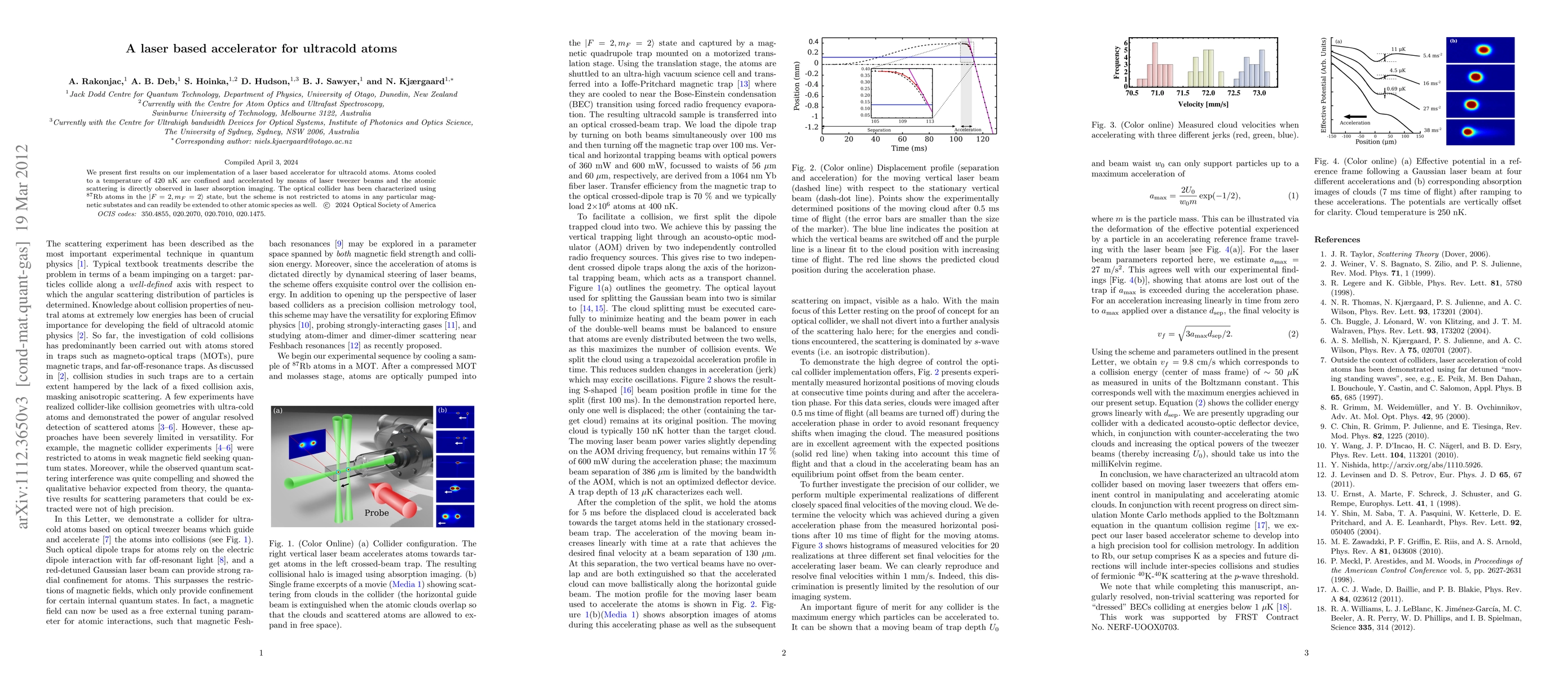 This paper reports the first results of a laser-based accelerator for ultracold atoms, where Rb87 atoms cooled to 420 nK are accelerated and observed using laser tweezers and absorption imaging. The method is versatile and can be applied to various atomic species beyond Rb87.