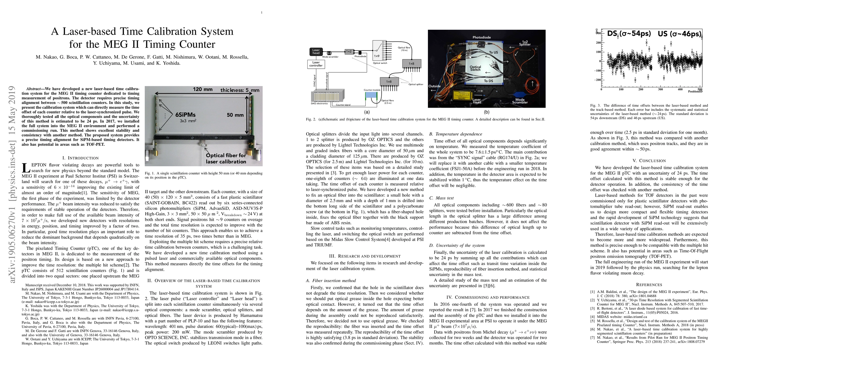 This paper introduces a laser-based time calibration system for the MEG II timing counter, achieving precise timing alignment for 500 scintillation counters with an uncertainty of 24 ps. The system was installed and tested in 2017, demonstrating stability and consistency, and has potential applications in SiPM-based detectors and TOF-PET.