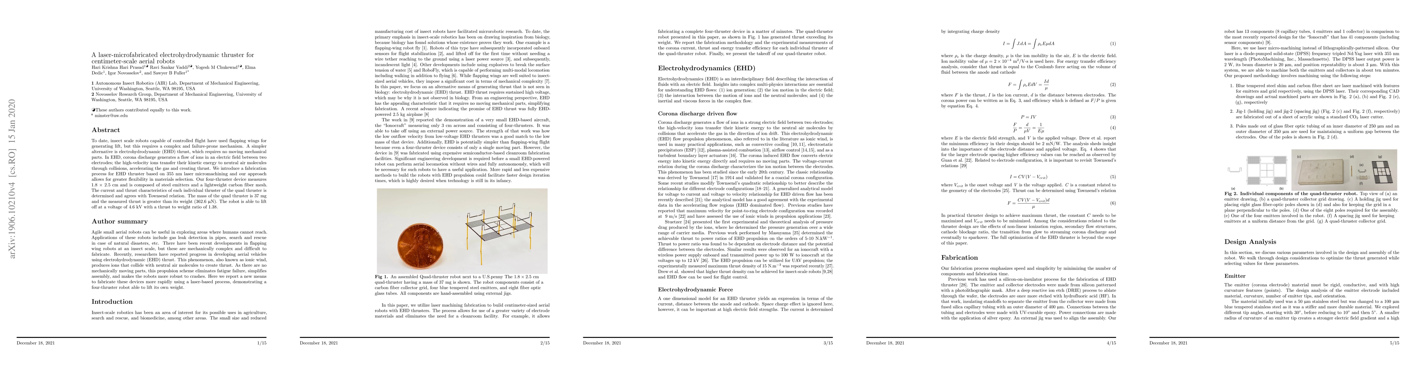 To date, insect scale robots capable of controlled flight have used flapping wings for generating lift, but this requires a complex and failure-prone mechanism. A simpler alternative is electrohydrodynamic (EHD) thrust, which requires no moving mechanical parts. In EHD, corona discharge generates a flow of ions in an electric field between two electrodes; the high-velocity ions transfer their kinetic energy to neutral air molecules through collisions, accelerating the gas and creating thrust. We introduce a fabrication process for EHD thruster based on 355 nm laser micromachining and our approach allows for greater flexibility in materials selection. Our four-thruster device measures 1.8 x 2.5 cm and is composed of steel emitters and a lightweight carbon fiber mesh. The current and thrust characteristics of each individual thruster of the quad thruster is determined and agrees with Townsend relation. The mass of the quad thruster is 37 mg and the measured thrust is greater than its weight (362.6 uN). The robot is able to lift off at a voltage of 4.6 kV with a thrust to weight ratio of 1.38.
