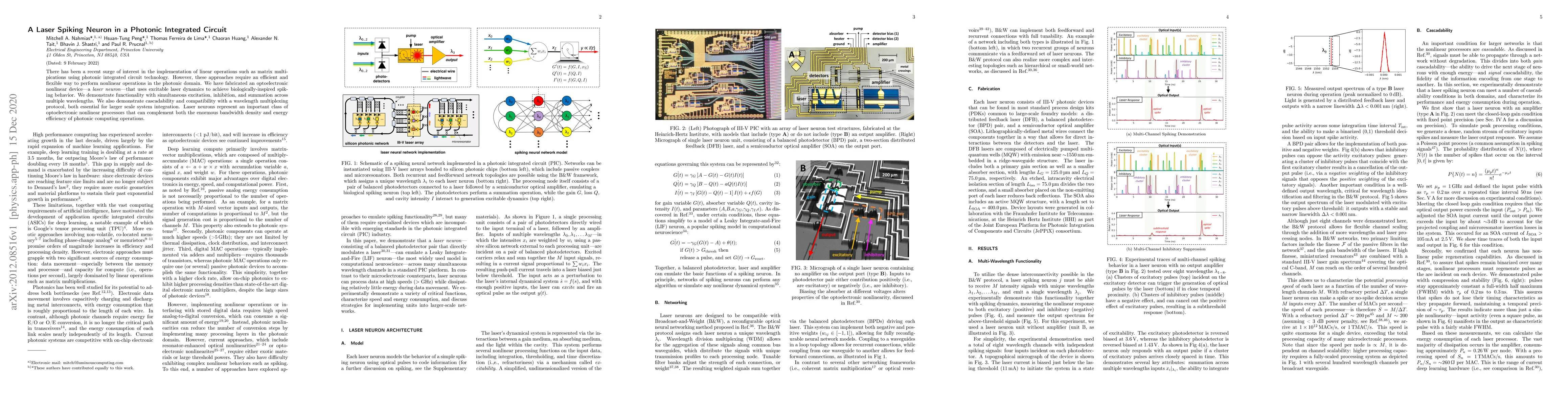 There has been a recent surge of interest in the implementation of linear operations such as matrix multipications using photonic integrated circuit technology. However, these approaches require an efficient and flexible way to perform nonlinear operations in the photonic domain. We have fabricated an optoelectronic nonlinear device--a laser neuron--that uses excitable laser dynamics to achieve biologically-inspired spiking behavior. We demonstrate functionality with simultaneous excitation, inhibition, and summation across multiple wavelengths. We also demonstrate cascadability and compatibility with a wavelength multiplexing protocol, both essential for larger scale system integration. Laser neurons represent an important class of optoelectronic nonlinear processors that can complement both the enormous bandwidth density and energy efficiency of photonic computing operations.