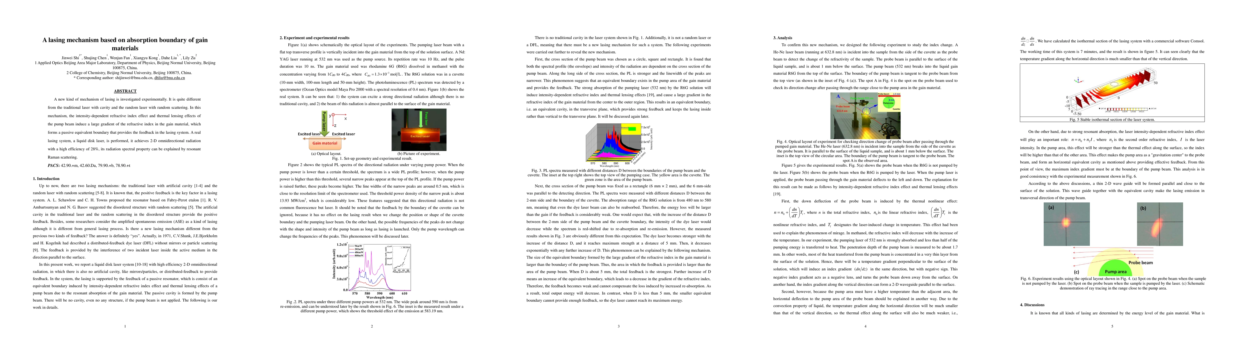 A new kind of mechanism of lasing is investigated experimentally. It is quite different from the traditional laser with cavity and the random laser with random scattering. In this mechanism, the intensity-dependent refractive index effect and thermal lensing effects of the pump beam induce a large gradient of the refractive index in the gain material, which forms a passive equivalent boundary that provides the feedback in the lasing system. A real lasing system, a liquid disk laser, is performed, it achieves 2-D omnidirectional radiation with a high efficiency of 28%, its radiation spectral property can be explained by resonant Raman scattering.