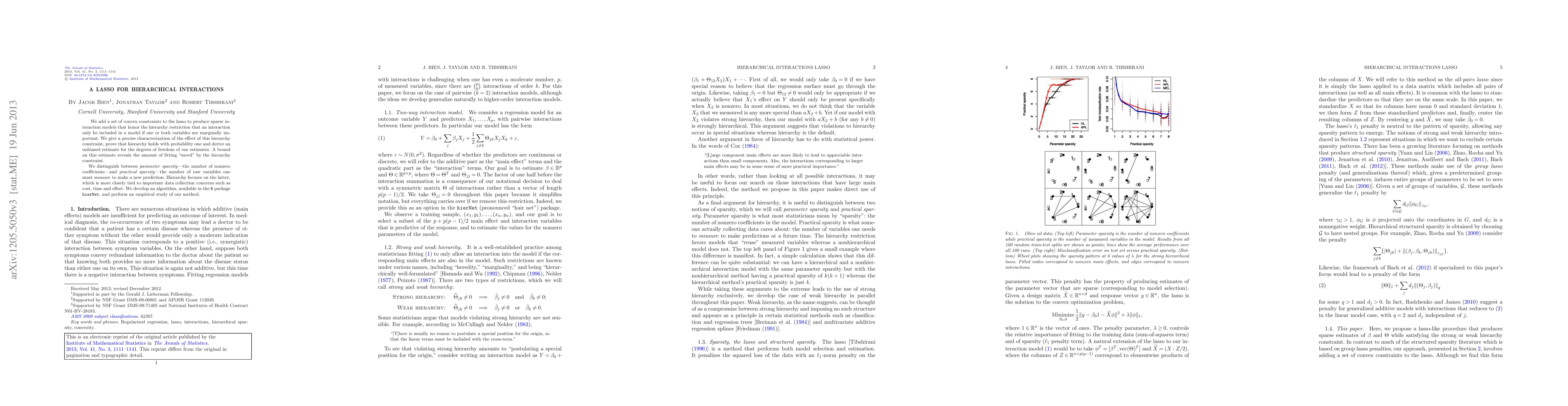 We add a set of convex constraints to the lasso to produce sparse interaction models that honor the hierarchy restriction that an interaction only be included in a model if one or both variables are marginally important. We give a precise characterization of the effect of this hierarchy constraint, prove that hierarchy holds with probability one and derive an unbiased estimate for the degrees of freedom of our estimator. A bound on this estimate reveals the amount of fitting "saved" by the hierarchy constraint. We distinguish between parameter sparsity - the number of nonzero coefficients - and practical sparsity - the number of raw variables one must measure to make a new prediction. Hierarchy focuses on the latter, which is more closely tied to important data collection concerns such as cost, time and effort. We develop an algorithm, available in the R package hierNet, and perform an empirical study of our method.