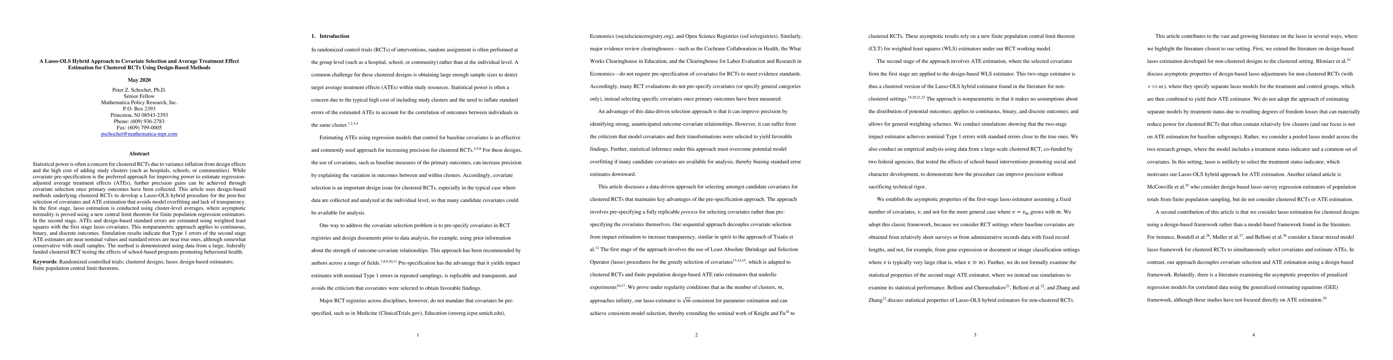 This paper proposes a Lasso-OLS hybrid method for covariate selection and average treatment effect estimation in clustered RCTs, leveraging design-based methods to enhance statistical power while avoiding overfitting. Simulation results show the method's effectiveness in maintaining nominal Type 1 errors and accurate standard errors, demonstrated through a real-world clustered RCT on school-based health programs.