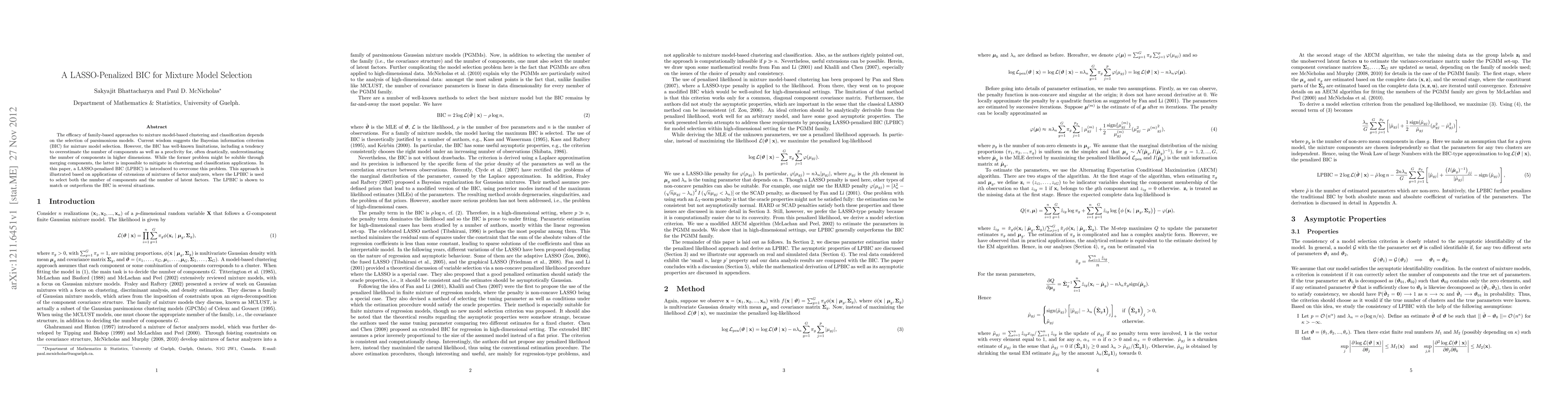 This paper introduces a LASSO-penalized BIC (LPBIC) to improve mixture model selection, addressing the BIC's tendency to overestimate components and underrepresent them in higher dimensions. The LPBIC is demonstrated through applications involving mixtures of factor analyzers, showing competitive or superior performance compared to the standard BIC.