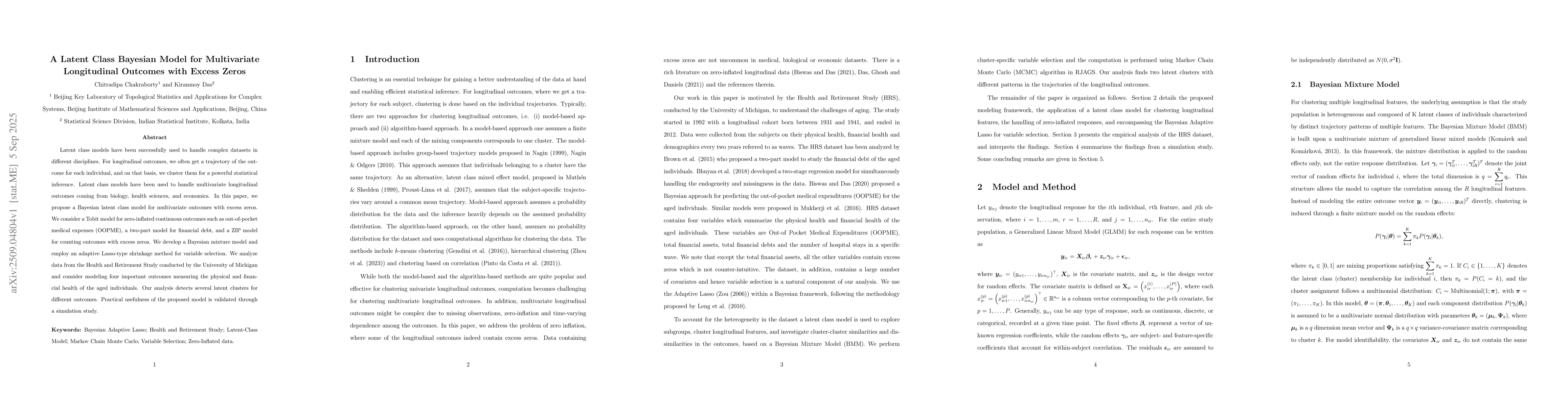 Latent class models have been successfully used to handle complex datasets in different disciplines. For longitudinal outcomes, we often get a trajectory of the outcome for each individual, and on that basis, we cluster them for a powerful statistical inference. Latent class models have been used to handle multivariate longitudinal outcomes coming from biology, health sciences, and economics. In this paper, we propose a Bayesian latent class model for multivariate outcomes with excess zeros. We consider a Tobit model for zero-inflated continuous outcomes such as out-of-pocket medical expenses (OOPME), a two-part model for financial debt, and a ZIP model for counting outcomes with excess zeros. We develop a Bayesian mixture model and employ an adaptive Lasso-type shrinkage method for variable selection. We analyze data from the Health and Retirement Study conducted by the University of Michigan and consider modeling four important outcomes measuring the physical and financial health of the aged individuals. Our analysis detects several latent clusters for different outcomes. Practical usefulness of the proposed model is validated through a simulation study.