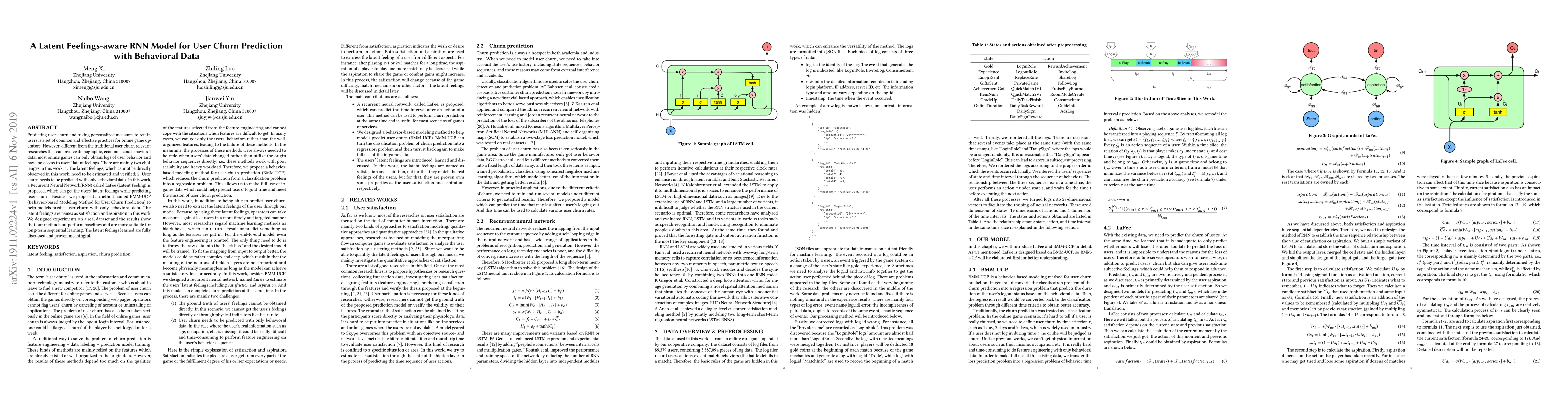A new RNN model, LaFee, predicts user churn with behavioral data while estimating users' latent feelings of satisfaction and aspiration. The method outperforms baselines and is suitable for long-term sequential learning.