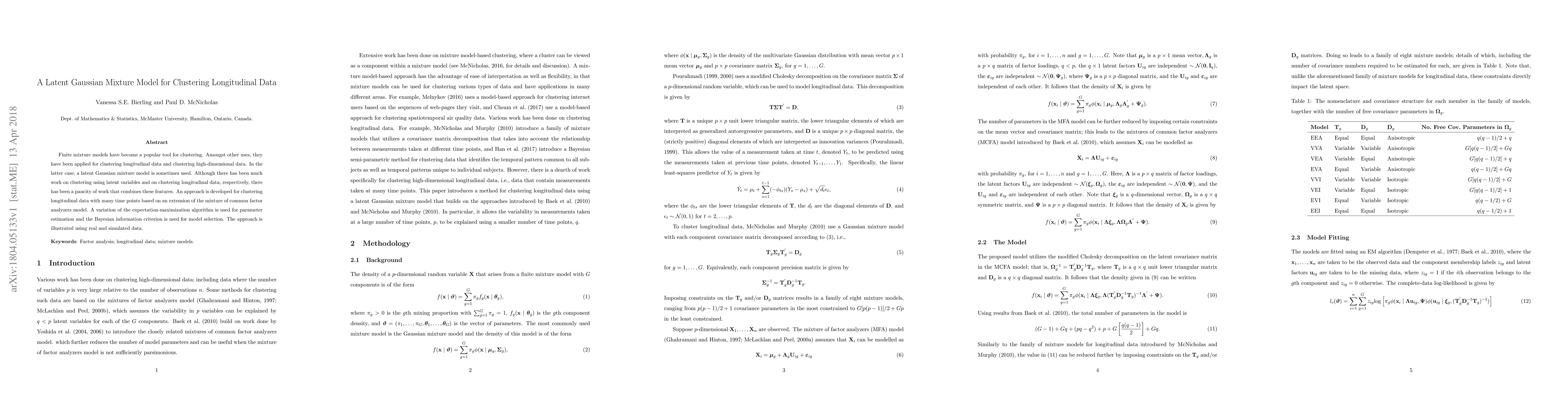 The paper proposes a Latent Gaussian Mixture Model for clustering longitudinal data, extending the mixture of common factor analyzers model. It uses a modified Cholesky decomposition on latent covariance matrices and an Expectation-Maximization (EM) algorithm for parameter estimation, with the Bayesian Information Criterion (BIC) for model selection.