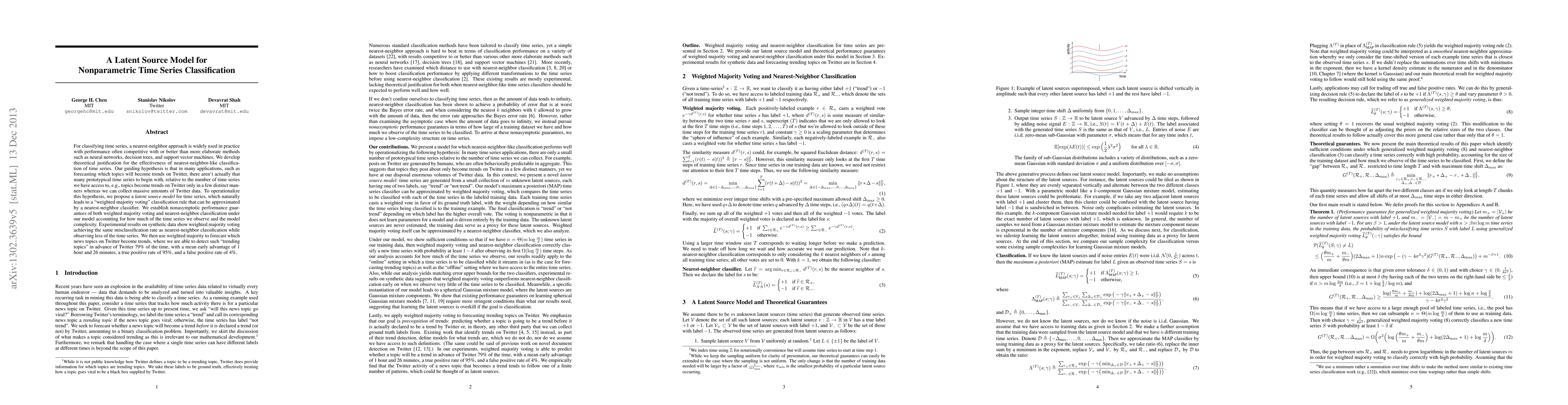 For classifying time series, a nearest-neighbor approach is widely used in practice with performance often competitive with or better than more elaborate methods such as neural networks, decision trees, and support vector machines. We develop theoretical justification for the effectiveness of nearest-neighbor-like classification of time series. Our guiding hypothesis is that in many applications, such as forecasting which topics will become trends on Twitter, there aren't actually that many prototypical time series to begin with, relative to the number of time series we have access to, e.g., topics become trends on Twitter only in a few distinct manners whereas we can collect massive amounts of Twitter data. To operationalize this hypothesis, we propose a latent source model for time series, which naturally leads to a "weighted majority voting" classification rule that can be approximated by a nearest-neighbor classifier. We establish nonasymptotic performance guarantees of both weighted majority voting and nearest-neighbor classification under our model accounting for how much of the time series we observe and the model complexity. Experimental results on synthetic data show weighted majority voting achieving the same misclassification rate as nearest-neighbor classification while observing less of the time series. We then use weighted majority to forecast which news topics on Twitter become trends, where we are able to detect such "trending topics" in advance of Twitter 79% of the time, with a mean early advantage of 1 hour and 26 minutes, a true positive rate of 95%, and a false positive rate of 4%.
