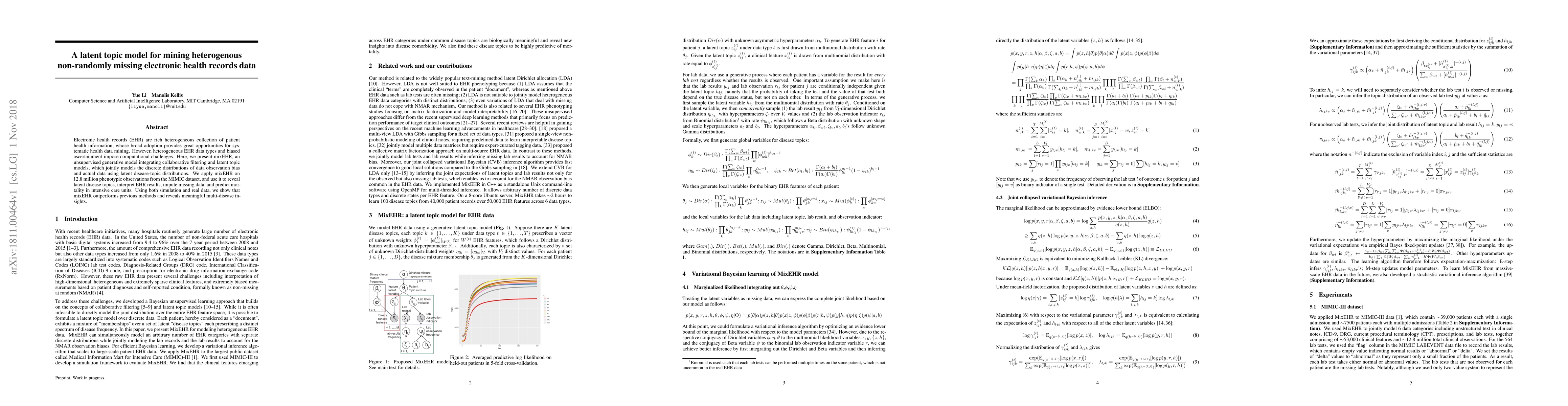 The paper introduces mixEHR, an unsupervised generative model combining collaborative filtering and latent topic models to handle heterogeneous and biased missing data in electronic health records (EHR). It outperforms previous methods by revealing latent disease topics, imputing missing data, and predicting mortality in intensive care units.