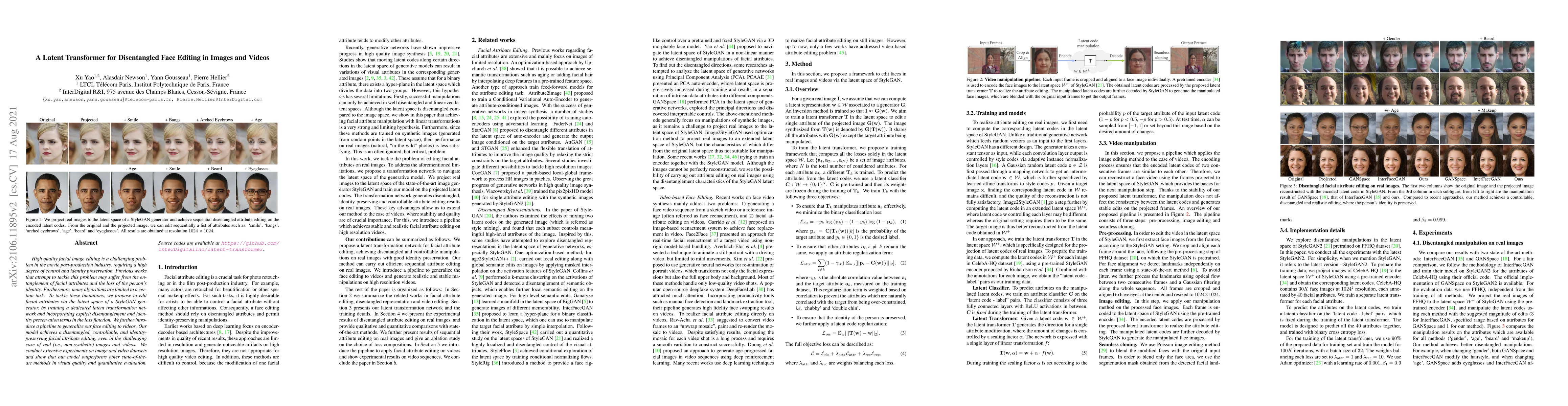 This paper proposes a latent transformer network trained on a StyleGAN generator to enable disentangled, controllable, and identity-preserving facial attribute editing in both images and videos. The model outperforms existing methods in visual quality and quantitative metrics, as demonstrated through extensive experiments.