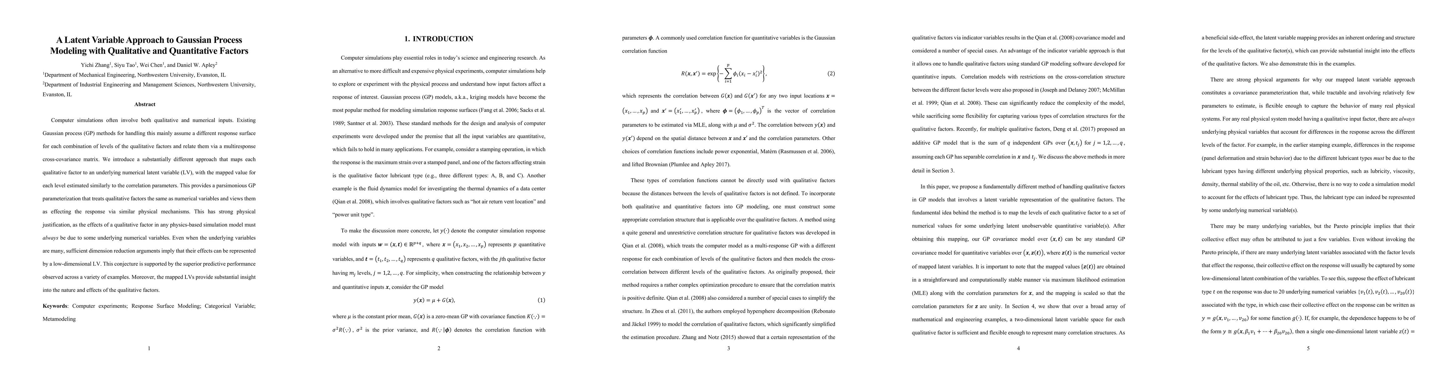 This paper proposes a novel latent variable approach to Gaussian process modeling that integrates both qualitative and quantitative factors. It maps qualitative factors to underlying numerical latent variables, offering a more parsimonious and physically justified parameterization that improves predictive performance and provides insights into factor effects.