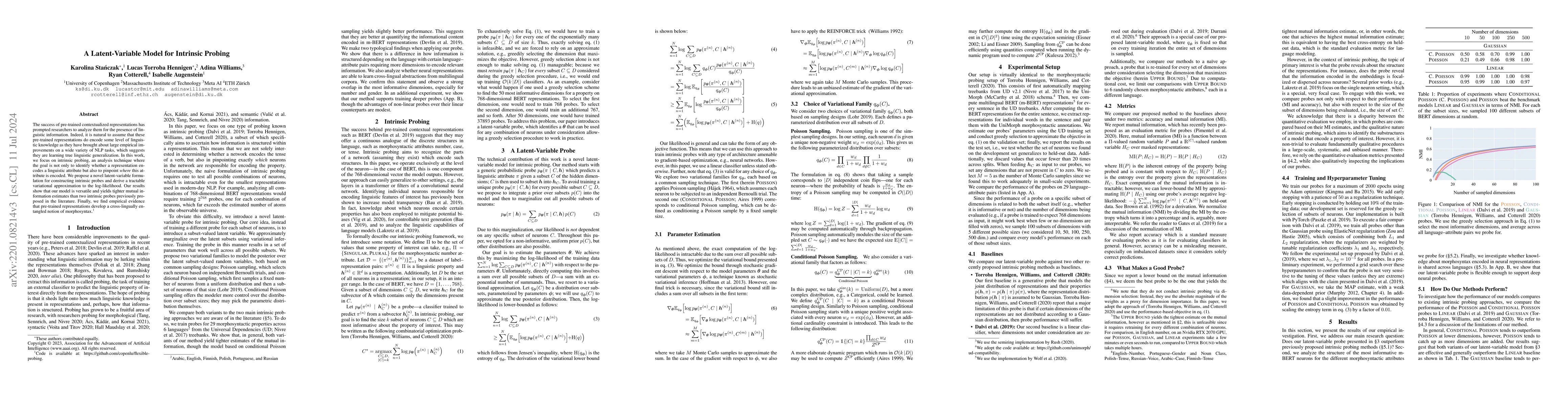 The success of pre-trained contextualized representations has prompted researchers to analyze them for the presence of linguistic information. Indeed, it is natural to assume that these pre-trained representations do encode some level of linguistic knowledge as they have brought about large empirical improvements on a wide variety of NLP tasks, which suggests they are learning true linguistic generalization. In this work, we focus on intrinsic probing, an analysis technique where the goal is not only to identify whether a representation encodes a linguistic attribute but also to pinpoint where this attribute is encoded. We propose a novel latent-variable formulation for constructing intrinsic probes and derive a tractable variational approximation to the log-likelihood. Our results show that our model is versatile and yields tighter mutual information estimates than two intrinsic probes previously proposed in the literature. Finally, we find empirical evidence that pre-trained representations develop a cross-lingually entangled notion of morphosyntax.