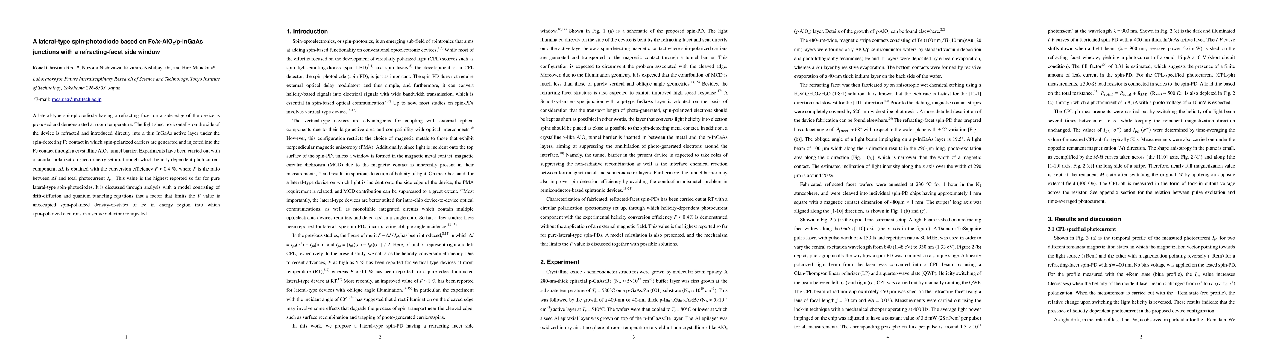 A lateral-type spin-photodiode having a refracting facet on a side edge of the device is proposed and demonstrated at room temperature. The light shed horizontally on the side of the device is refracted and introduced directly into a thin InGaAs active layer under the spin-detecting Fe contact in which spin-polarized carriers are generated and injected into the Fe contact through a crystalline AlOx tunnel barrier. Experiments have been carried out with a circular polarization spectrometry set up, through which helicity-dependent photocurrent component, dI, is obtained with the conversion efficiency F ~ 0.4 %, where F is the ratio between dI and total photocurrent Iph. This value is the highest reported so far for pure lateral-type spin-photodiodes. It is discussed through analysis with a model consisting of drift-diffusion and quantum tunneling equations that a factor that limits the F value is unoccupied spin-polarized density-of-states of Fe in energy region into which spin-polarized electrons in a semiconductor are injected.