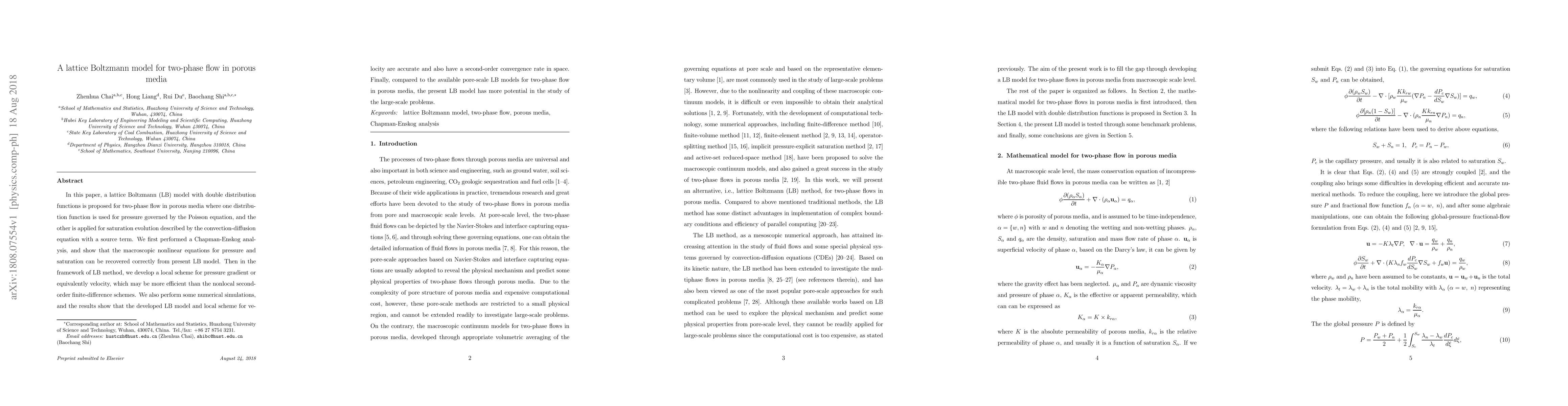 This paper proposes a lattice Boltzmann model with double distribution functions for two-phase flow in porous media, demonstrating its accuracy and efficiency through a Chapman-Enskog analysis and numerical simulations, showing second-order convergence and potential for large-scale problem studies.
