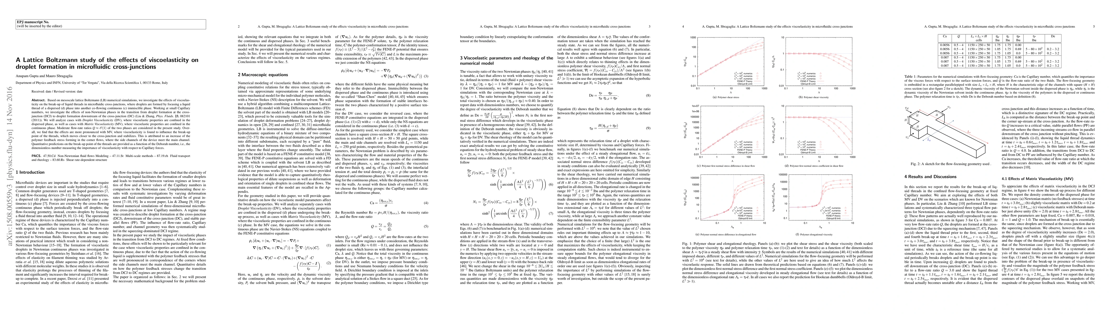 This study uses lattice Boltzmann simulations to explore how viscoelasticity affects droplet formation in microfluidic cross-junctions. It finds that matrix viscoelasticity significantly influences the break-up point of liquid threads, moving it closer to the junction and stabilizing it due to increased polymer feedback stress.