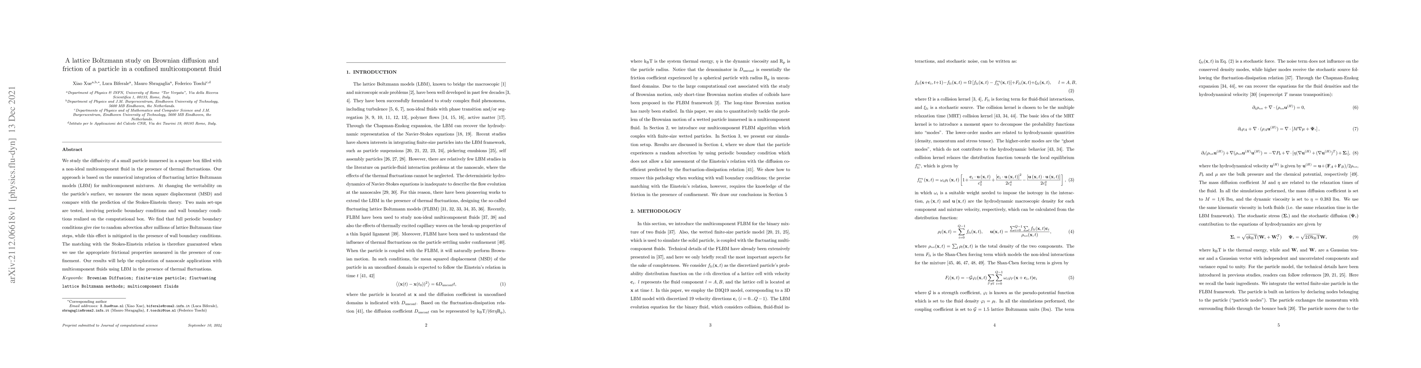Researchers studied how a small particle moves in a confined fluid with multiple components, using lattice Boltzmann models to simulate thermal fluctuations and friction effects.