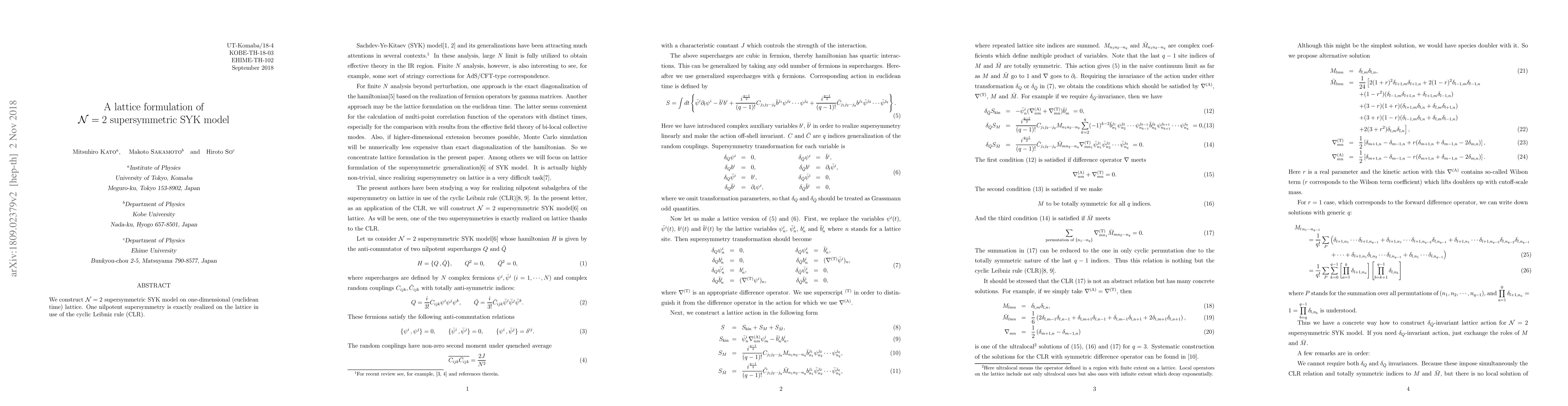 Summary: This paper constructs a lattice formulation of the N=2 supersymmetric SYK model on a one-dimensional Euclidean time lattice, utilizing the cyclic Leibniz rule to exactly realize one nilpotent supersymmetry.