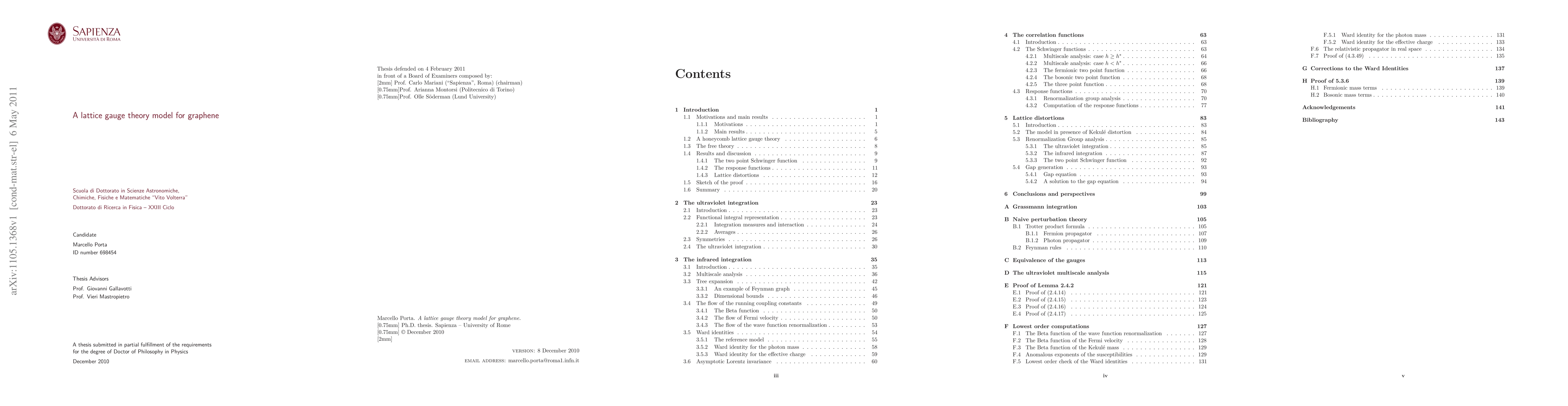 In this Ph.D. thesis a model for graphene in presence of quantized electromagnetic interactions is introduced. The zero and low temperature properties of the model are studied using rigorous renormalization group methods and lattice Ward identities. In particular, it is shown that, at all orders in renormalized perturbation theory, the Schwinger functions and the response functions decay with interaction dependent anomalous exponents. Regarding the 2-point Schwinger function, the wave function renormalization diverges in the infrared limit, while the effective Fermi velocity flows to the speed of light. Concerning the response functions, those associated to a Kekul\'e distortion of the honeycomb lattice and to a charge density wave instability are enhanced by the electromagnetic electron-electron interactions (their scaling in real space is depressed), while the lowest order correction to the scaling exponent of the density-density response function is vanishing. Then, the model in presence of a fixed Kekul\'e distortion is studied, and it is shown that the interaction strongly renormalizes the effective amplitude of the lattice distortion. Finally, the effect of the electronic repulsion on the Peierls-Kekul\'e instability is discussed by deriving a non-BCS gap equation, from which we find evidence that strong electromagnetic interactions facilitate the spontaneous distortion of the lattice and the opening of a gap. This thesis is based on joint work with A. Giuliani and V. Mastropietro.