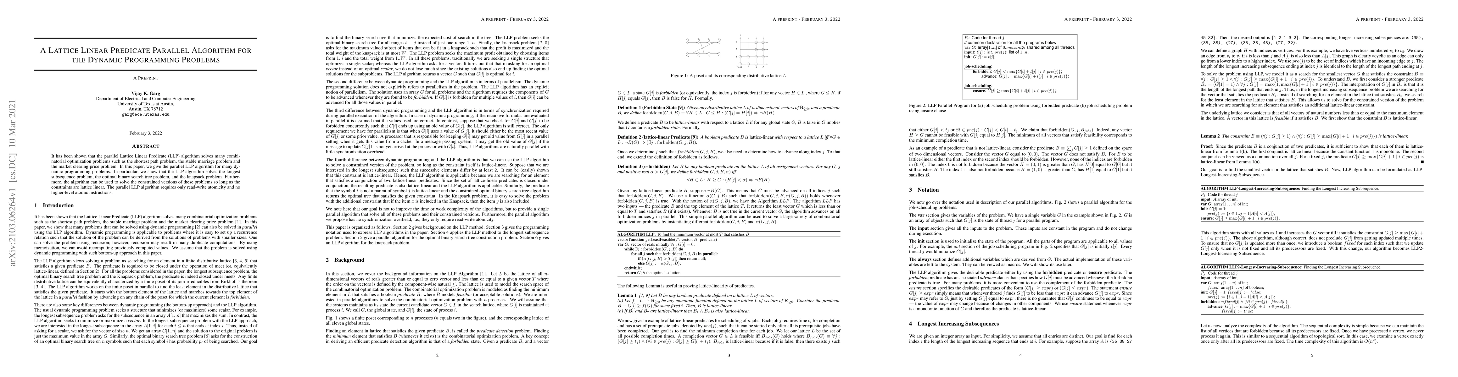 This paper presents a parallel Lattice Linear Predicate (LLP) algorithm for dynamic programming problems, demonstrating its application to the longest subsequence problem, optimal binary search tree problem, and knapsack problem. The algorithm requires only read-write atomicity and can handle constrained versions as long as the constraints are lattice linear.