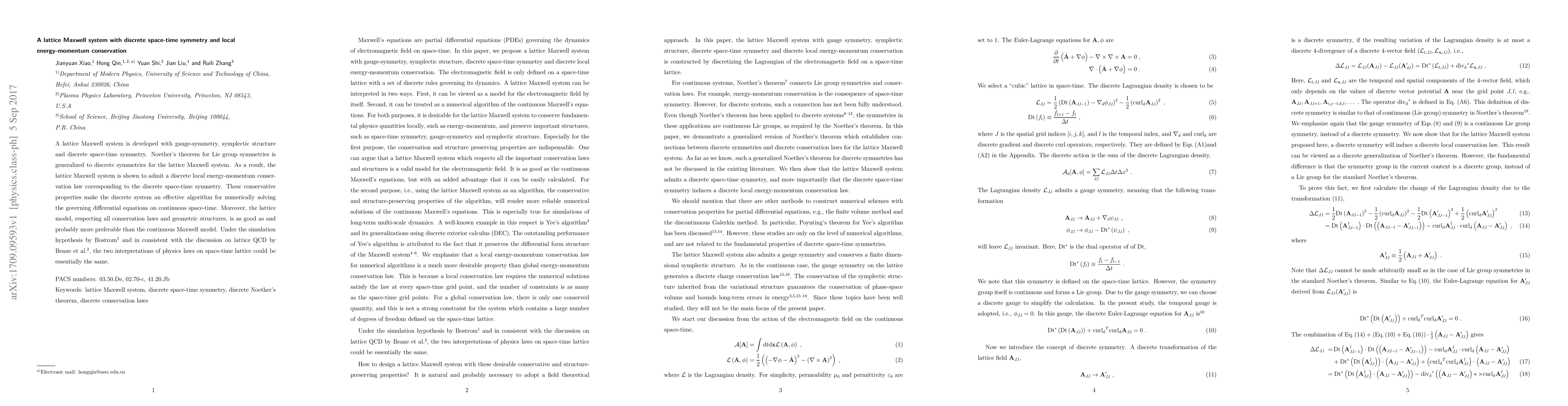 A lattice Maxwell system is developed with gauge-symmetry, symplectic structure and discrete space-time symmetry. Noether's theorem for Lie group symmetries is generalized to discrete symmetries for the lattice Maxwell system. As a result, the lattice Maxwell system is shown to admit a discrete local energy-momentum conservation law corresponding to the discrete space-time symmetry. These conservative properties make the discrete system an effective algorithm for numerically solving the governing differential equations on continuous space-time. Moreover, the lattice model, respecting all conservation laws and geometric structures, is as good as and probably more preferable than the continuous Maxwell model. Under the simulation hypothesis by Bostrom and in consistent with the discussion on lattice QCD by Beane et al., the two interpretations of physics laws on space-time lattice could be essentially the same.