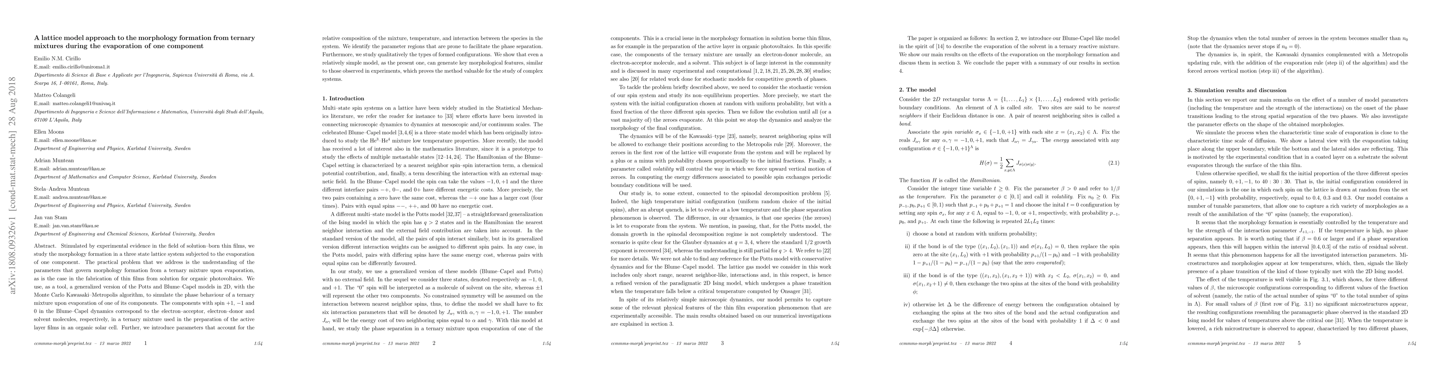 Stimulated by experimental evidence in the field of solution--born thin films, we study the morphology formation in a three state lattice system subjected to the evaporation of one component. The practical problem that we address is the understanding of the parameters that govern morphology formation from a ternary mixture upon evaporation, as is the case in the fabrication of thin films from solution for organic photovoltaics. We use, as a tool, a generalized version of the Potts and Blume-Capel models in 2D, with the Monte Carlo Kawasaki-Metropolis algorithm, to simulate the phase behaviour of a ternary mixture upon evaporation of one of its components. The components with spin $+1$, $-1$ and $0$ in the Blume-Capel dynamics correspond to the electron--acceptor, electron--donor and solvent molecules, respectively, in a ternary mixture used in the preparation of the active layer films in an organic solar cell. Further, we introduce parameters that account for the relative composition of the mixture, temperature, and interaction between the species in the system. We identify the parameter regions that are prone to facilitate the phase separation. Furthermore, we study qualitatively the types of formed configurations. We show that even a relatively simple model, as the present one, can generate key morphological features, similar to those observed in experiments, which proves the method valuable for the study of complex systems.