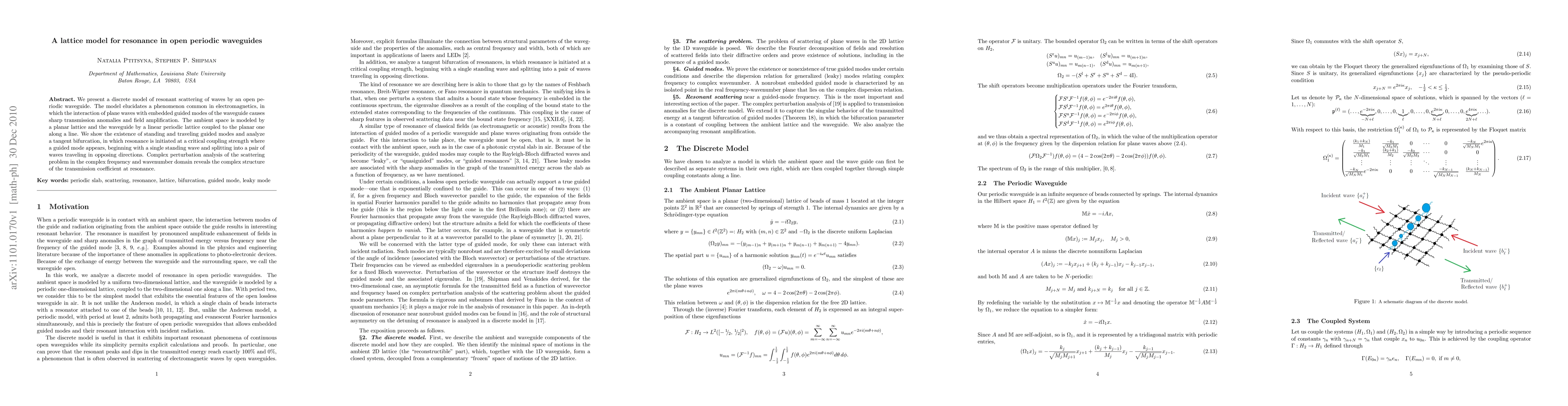 This paper introduces a lattice model for wave resonance in open periodic waveguides, demonstrating how plane waves interact with guided modes to produce sharp transmission anomalies and field amplification. The study reveals standing and traveling guided modes and analyzes a tangent bifurcation where resonance occurs at a critical coupling strength, leading to wave splitting.