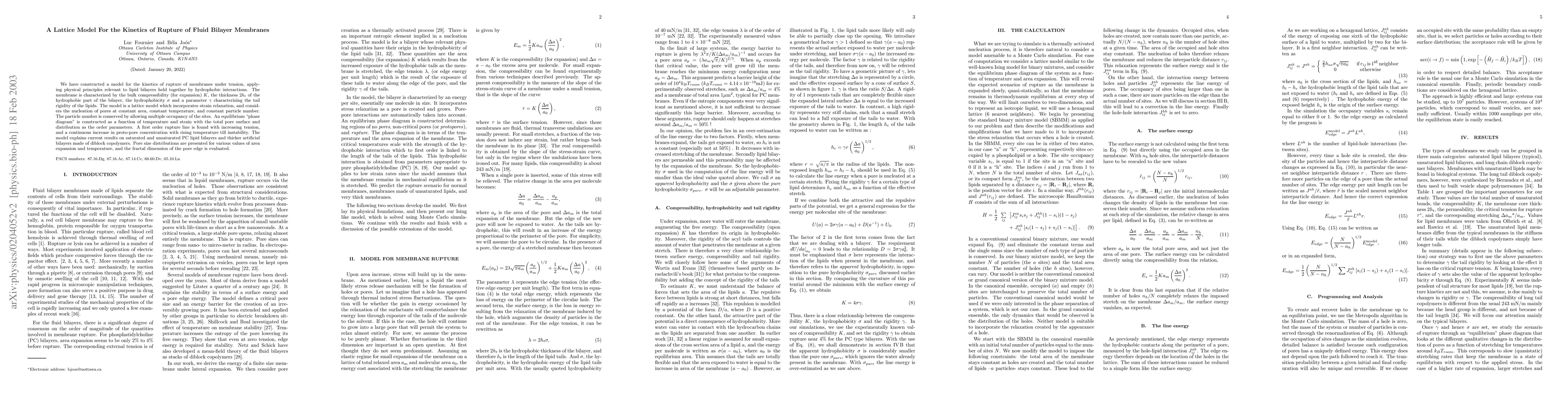 We have constructed a model for the kinetics of rupture of membranes under tension, applying physical principles relevant to lipid bilayers held together by hydrophobic interactions. The membrane is characterized by the bulk compressibility (for expansion), the thickness of the hydrophobic part of the bilayer, the hydrophobicity and a parameter characterizing the tail rigidity of the lipids. The model is a lattice model which incorporates strain relaxation, and considers the nucleation of pores at constant area, constant temperature, and constant particle number. The particle number is conserved by allowing multiple occupancy of the sites. An equilibrium ``phase diagram'' is constructed as a function of temperature and strain with the total pore surface and distribution as the order parameters. A first order rupture line is found with increasing tension, and a continuous increase in proto-pore concentration with rising temperature till instability. The model explains current results on saturated and unsaturated PC lipid bilayers and thicker artificial bilayers made of diblock copolymers. Pore size distributions are presented for various values of area expansion and temperature, and the fractal dimension of the pore edge is evaluated.