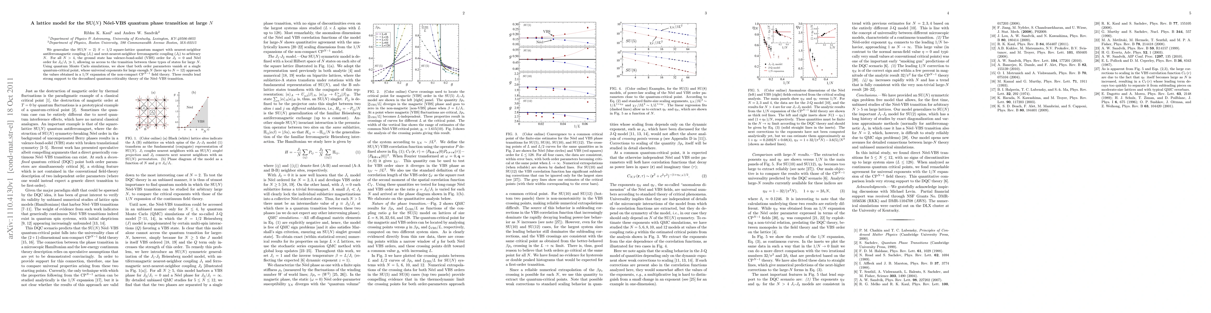 The paper presents a lattice model for the SU(N) Neel-VBS quantum phase transition at large N, generalizing the SU(2) model. Quantum Monte Carlo simulations reveal that for N > 4, both order parameters vanish at a single critical point, with universal exponents approaching those of a 1/N expansion of the CP^(N-1) field theory. This supports the deconfined quantum-criticality theory of the Neel--VBS transition.