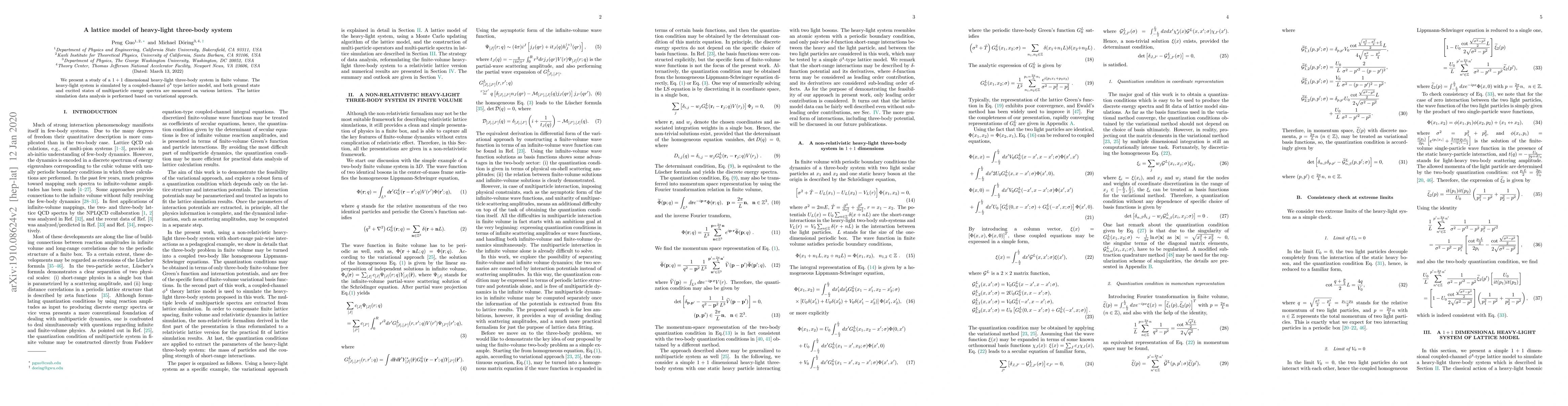 Researchers created a lattice model to study a heavy-light three-body system in 1+1 dimensions, exploring its ground and excited states using variational approach on various lattices.