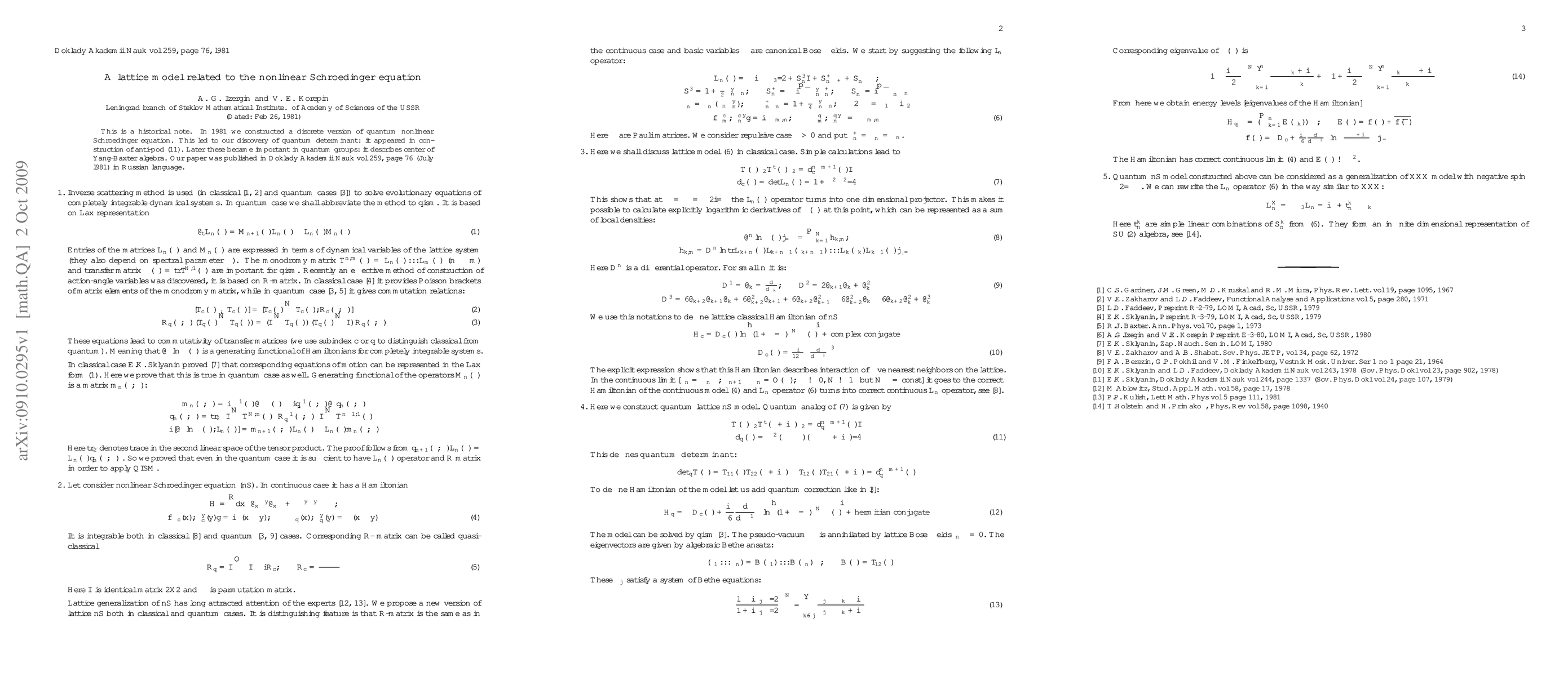 Researchers discovered a discrete version of the nonlinear Schroedinger equation in 1981, leading to the creation of quantum determinant which plays a crucial role in quantum groups.