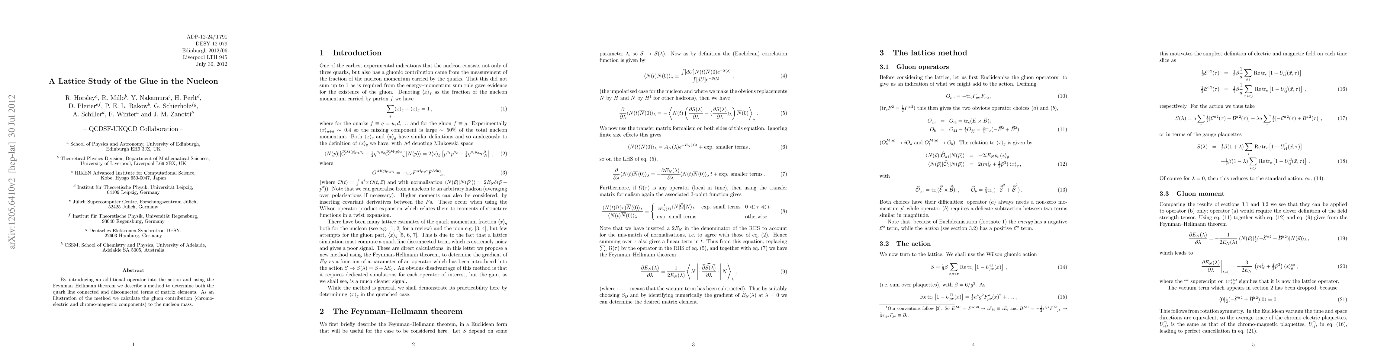By introducing an additional operator into the action and using the Feynman-Hellmann theorem we describe a method to determine both the quark line connected and disconnected terms of matrix elements. As an illustration of the method we calculate the gluon contribution (chromo-electric and chromo-magnetic components) to the nucleon mass.