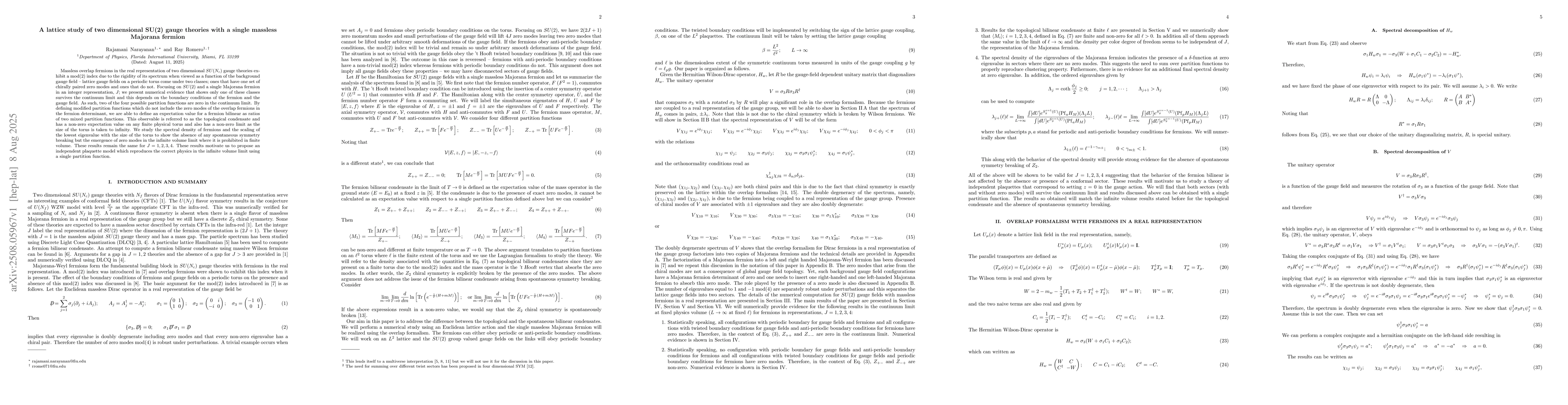 The paper presents a detailed lattice study of two-dimensional SU(2) gauge theories with a single massless Majorana fermion, introducing a topological condensate as a novel observable and proposing a plaquette model for infinite volume limit analysis.